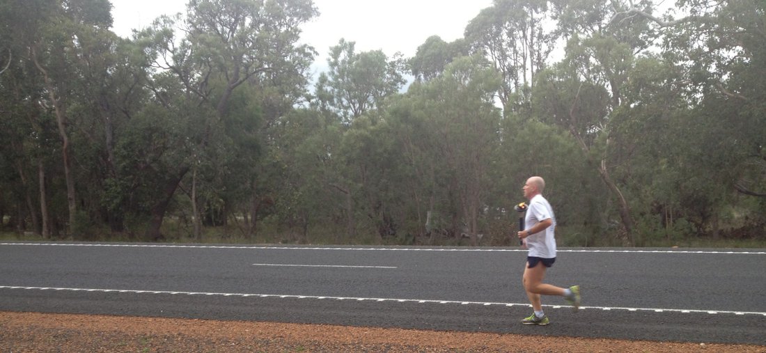 Having followed our own various schedules for the morning, all our three teams now converged in the centre of Busselton and ran down the main street, meeting local marathon runner Frank, who ran with the Torch to our scheduled meeting ...