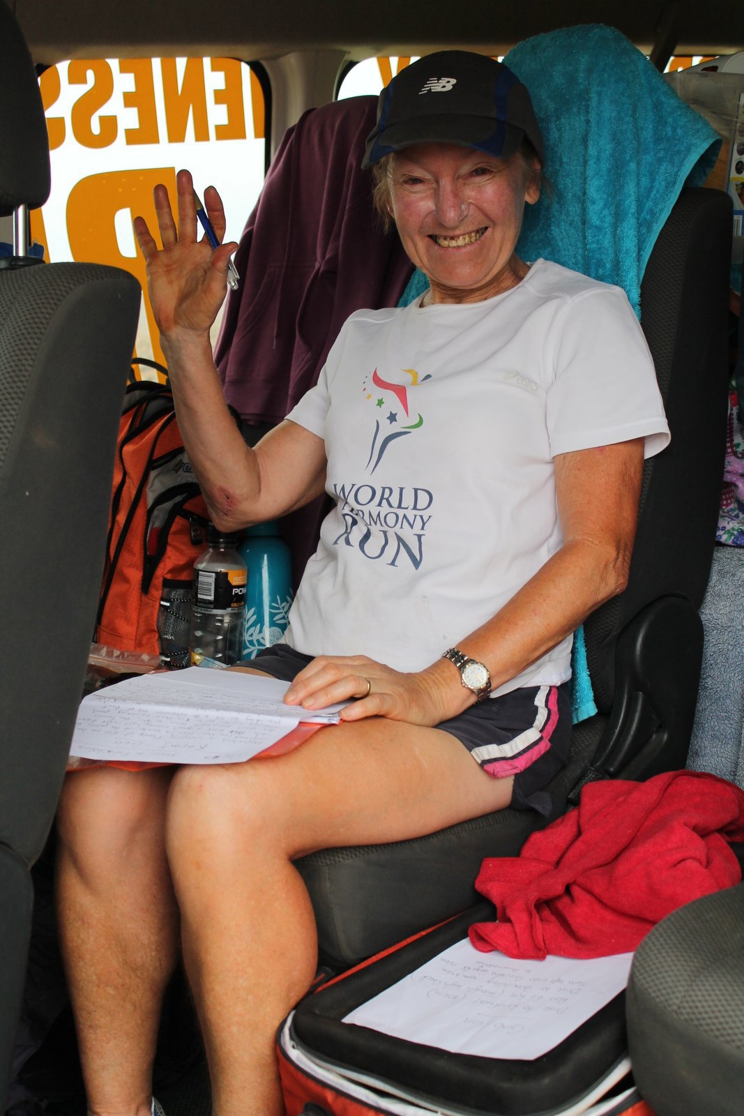 After two hours of delightful running on, thank goodness, a bitumen smooth road, a car pulled over in front of us and stopped. A cheery face greeted us with a smile half hidden behind white whiskers topped with a bushman’s hat and he asked: “would you like a drink, you can have one each”. We wasted no time in chorusing “yes please” and were handed a cold Powerade each, quite the best drink I’ve ever had considering I had run out of drink. He then sped off without further ado. We were amazed at his kindness as he had made a special trip to buy them for us. We discovered later his name is Talc Alf, a colourful local character, nicknamed “the Crazy Man of the desert”.
