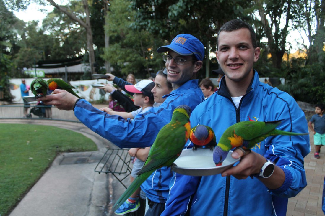 A mixture of water and honey is poured onto plates, which visitors hold aloft, waiting for the first brave Lorakeet to drink some of the 'nectar'.