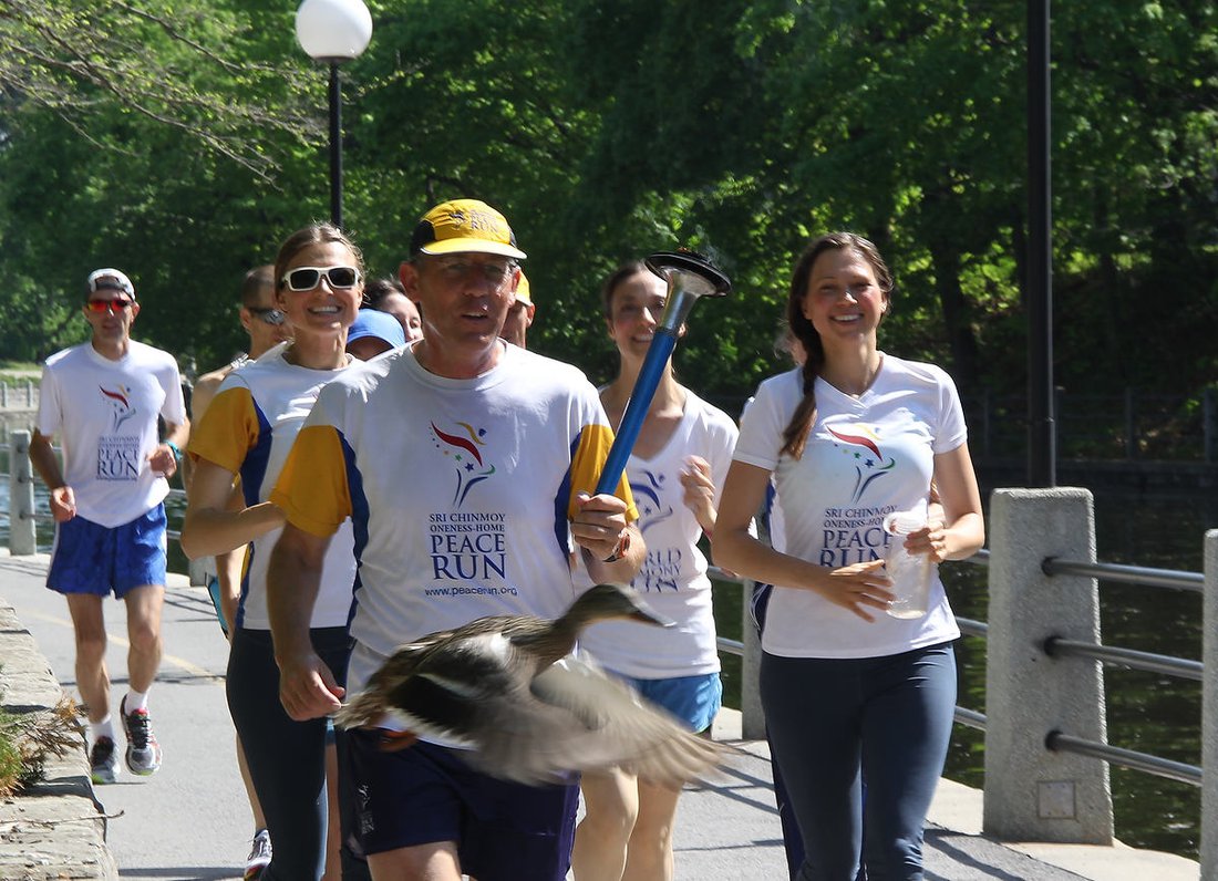 Salil, Executive Director of the Peace Run, causes a stir with a local duck as he carries the Torch.