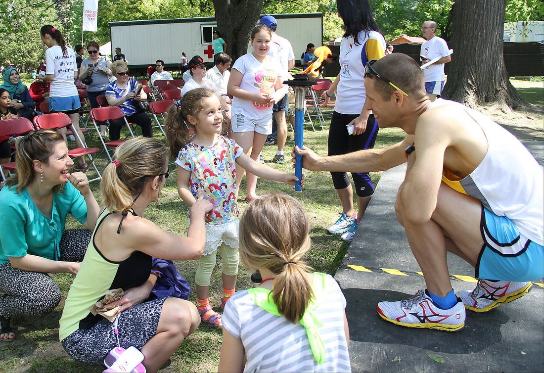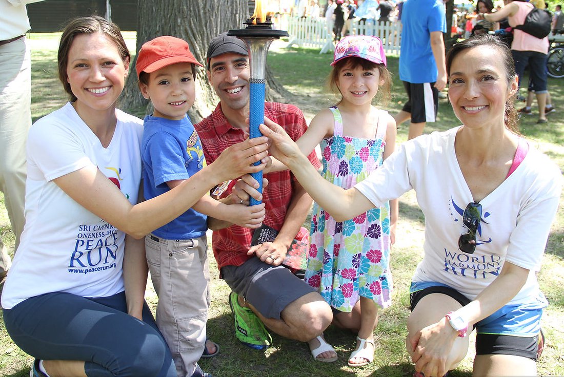 Holding the Peace Torch with our Peace Run team are Ozgur Sanli, Neda Babashli and Ozgur's two children Enes and Dilara.