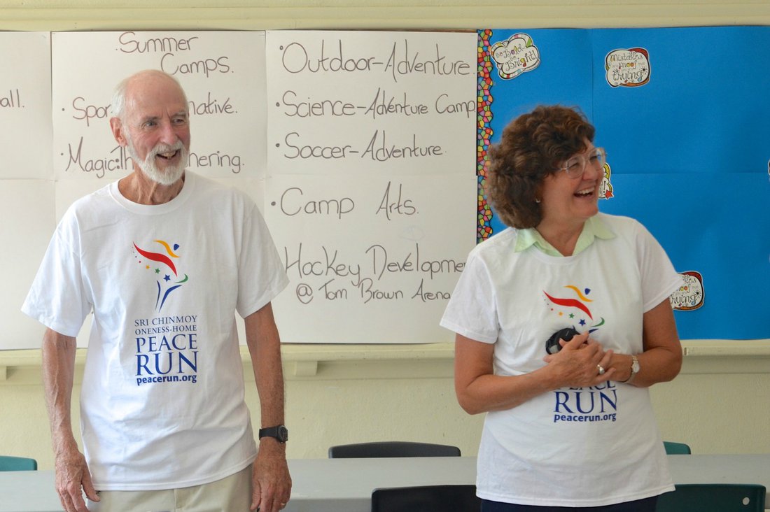 Bob et Joan nous ont accompagné à la cérémonie vêtus de leurs nouveaux T-shirts accrocheurs de la Course de la Paix.