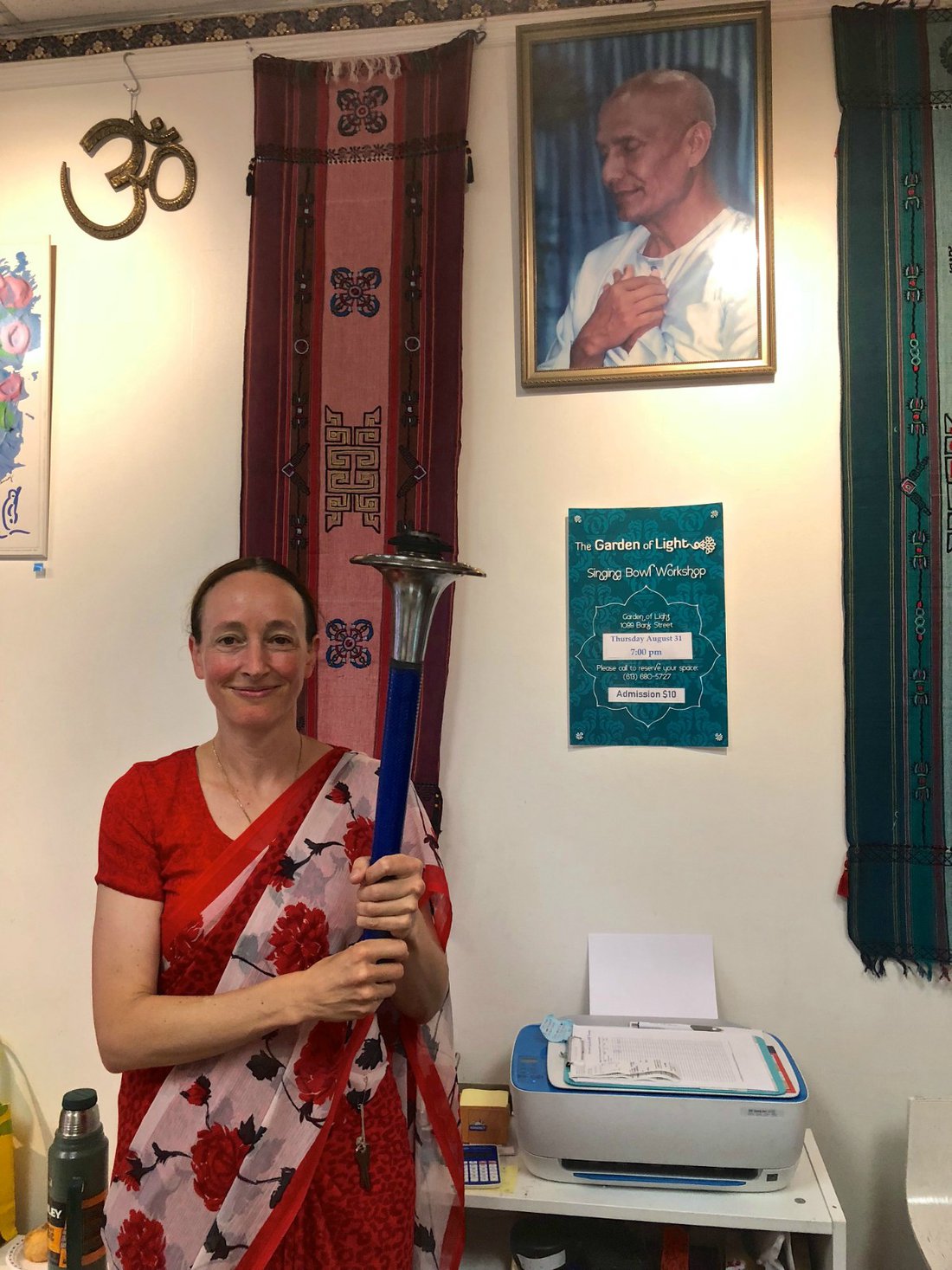 Nilasha, une de nos coordonnatrices étoiles de la Course de la Paix, travaille au « Garden of Light » (magasin Jardin de Lumière). Elle tenait une bannière où on pouvait lire:
