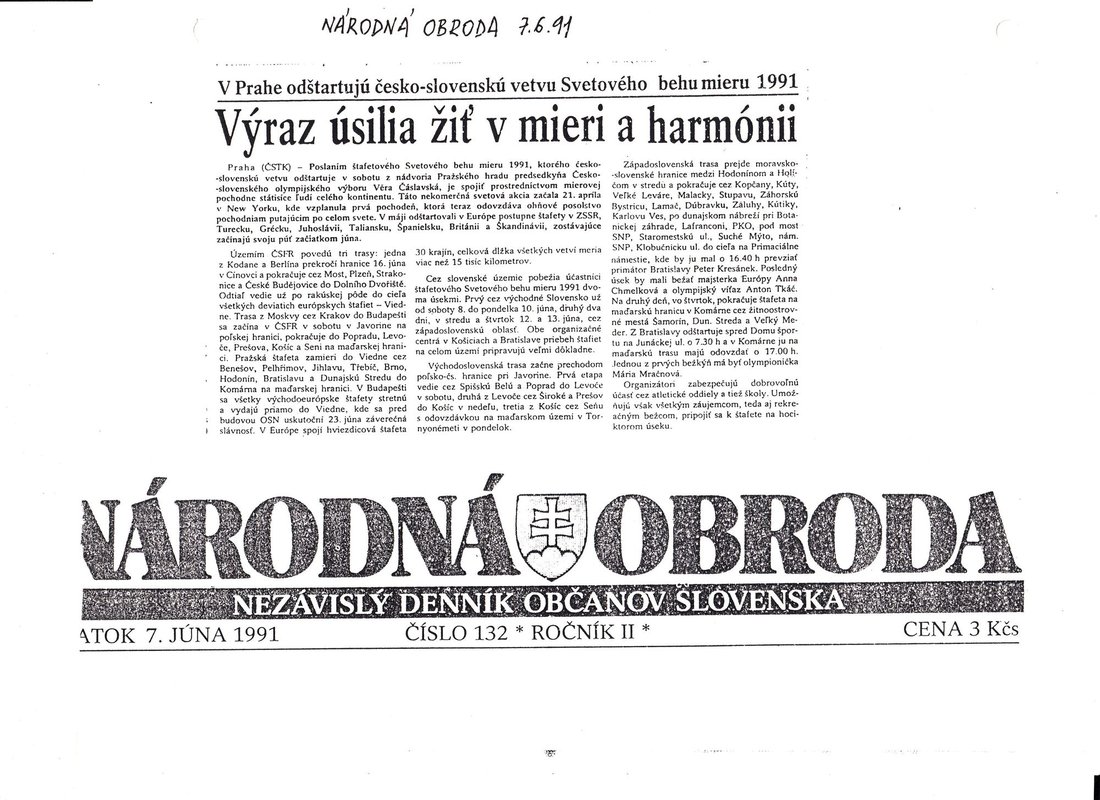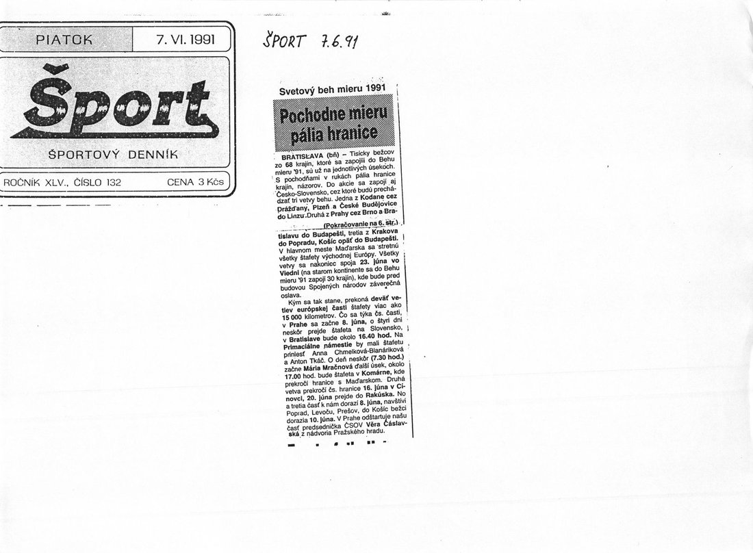 Střední větev 08.06. 1991 Praha-Hradčany - Benešov 09.06. 1991 Benešov - Jihlava 10.06. 1991 Jihlava - Brno 11.06. 1991 Brno - Hodonín 12.06. 1991 Hodonín - Bratislava 13.06. 1991 Bratislava - Komárno
