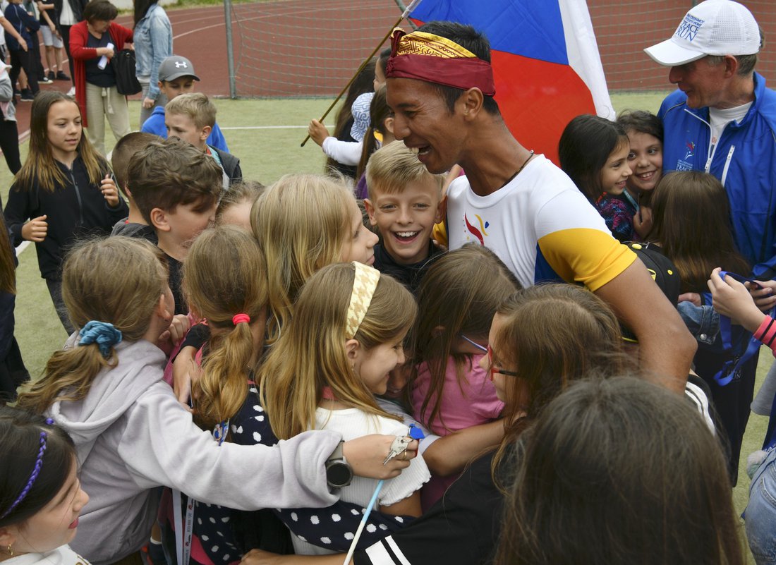 Children from Kravaře Primary School came to meet us and ran with us to their school.