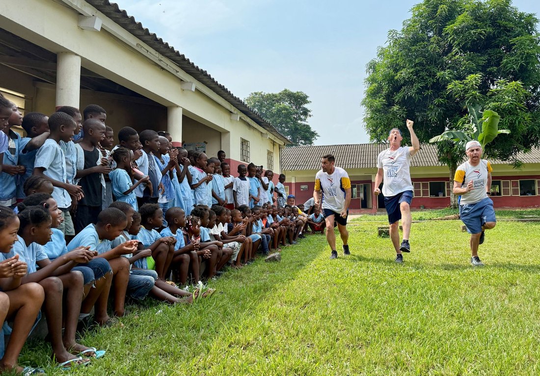 Os nossos corredores num mood tipicamente santomense, “leve, leve”, antes de começar a visita às escolas.