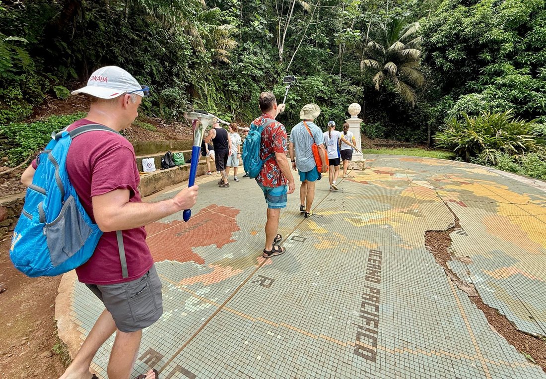 Our team at the “Equator Line,” the landmark that precisely indicates where the Equator passes through the island. Popularly called the “Center of the World,” it symbolizes the meeting point of the Northern and Southern Hemispheres. Centre of the World,” it symbolises
