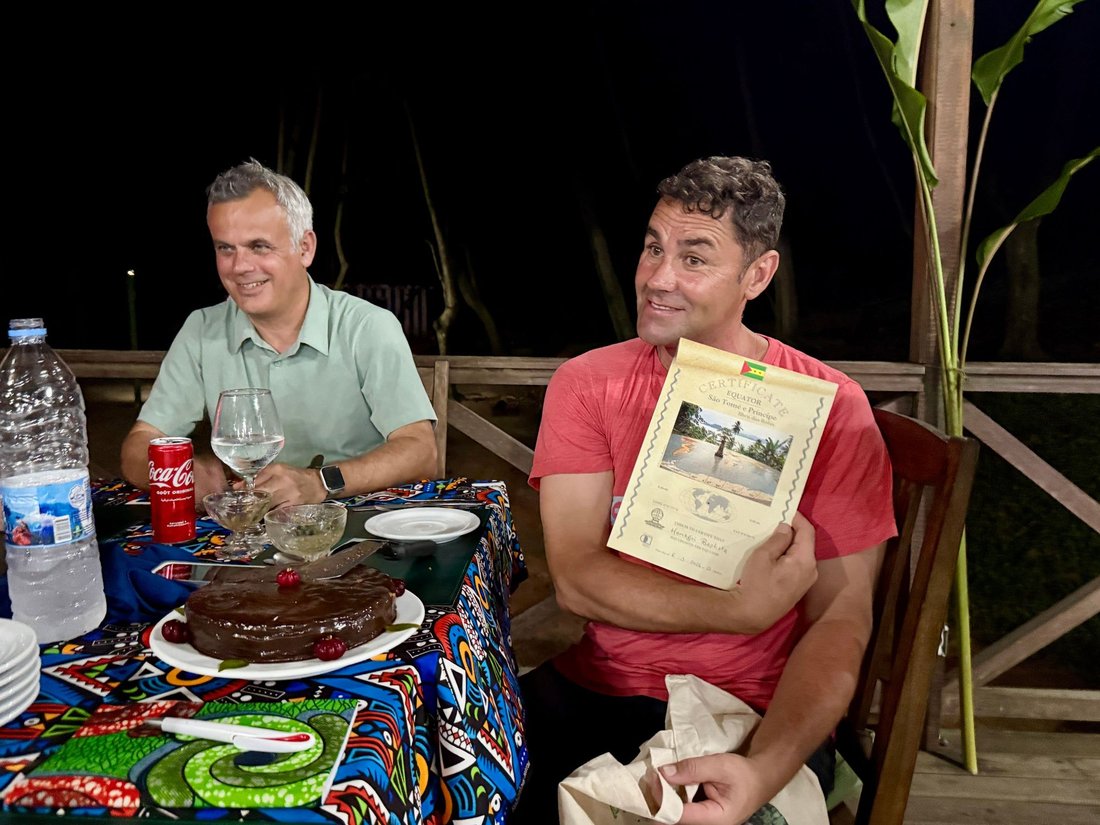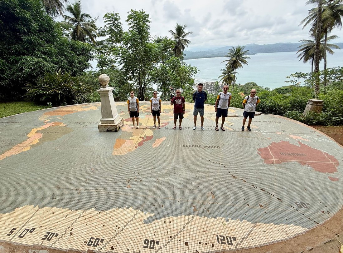 A nossa equipa na “Linha do Equador”, que assinala a passagem exata da linha do Equador pela ilha. Conhecido como “Centro do Mundo”, marca o ponto onde os hemisférios Norte e Sul se encontram.
