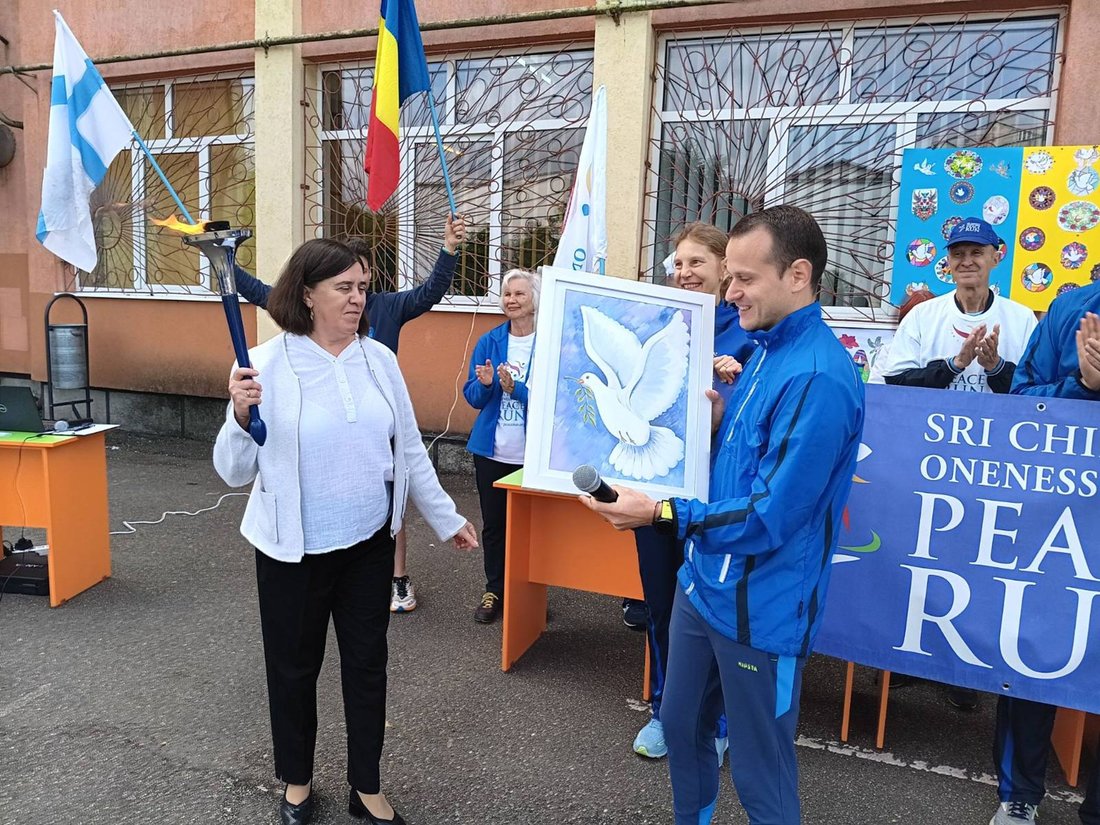 Oferind școlii pictura "Armonie Mondială" realizat de către Fondatorul Alergării, Sri Chinmoy