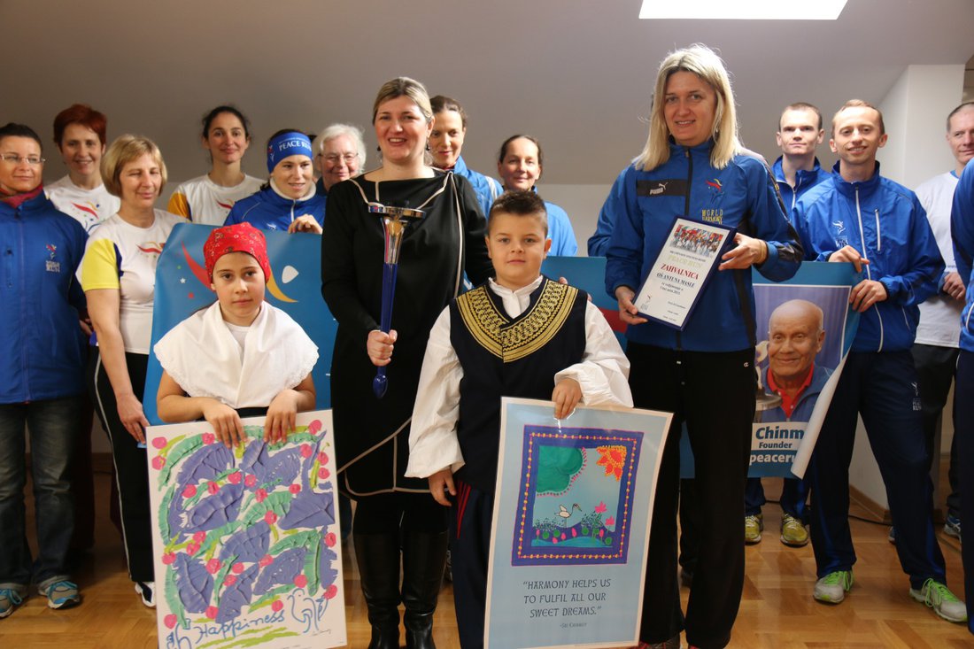 Naš lokalni koordinator, Gordana, prezentira Kornelisi Koncul, predstavnici škole, plaketu i neki od umjetničkih radova Sri Chinmoya, osnivača Utrke mira. Slika na desnoj strani nosi naslov "Harmonija nam pomaže da ispunimo sve svoje slatke snove ".