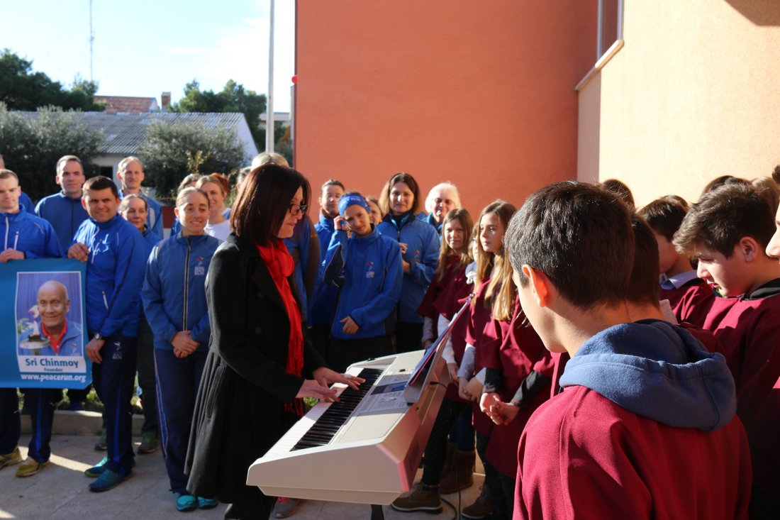 Jadranka Dabrović, i ostali divni predstavnici škole, primili su tri umjetnička rada osnivača Utrke mira, Sri Chinmoya, koji nose naslove ( s lijeva na desno) "San", "Svjetska Harmonija" i "Mir hrani djecu".