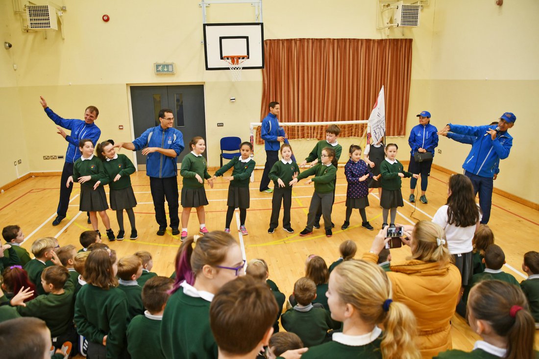 The teachers at Scoil Aodh Rua agus Nuala gather for a photo and the school children give them a tremendous cheer!