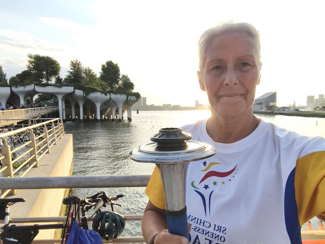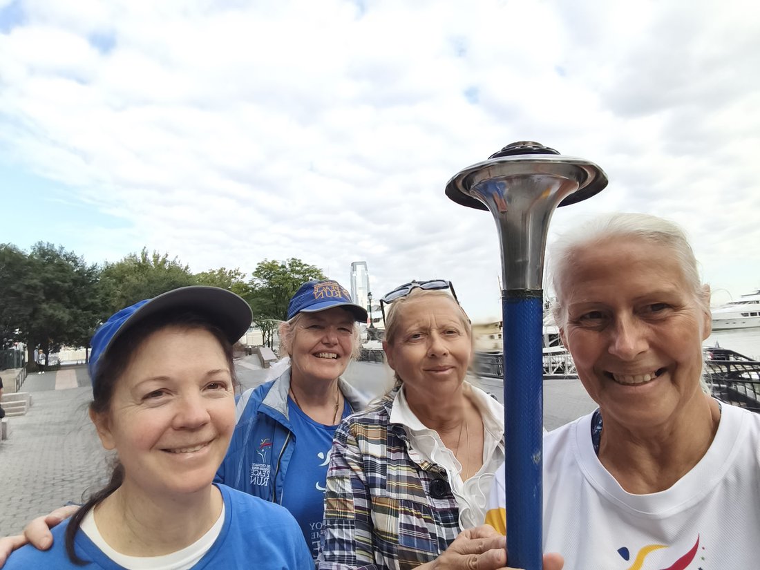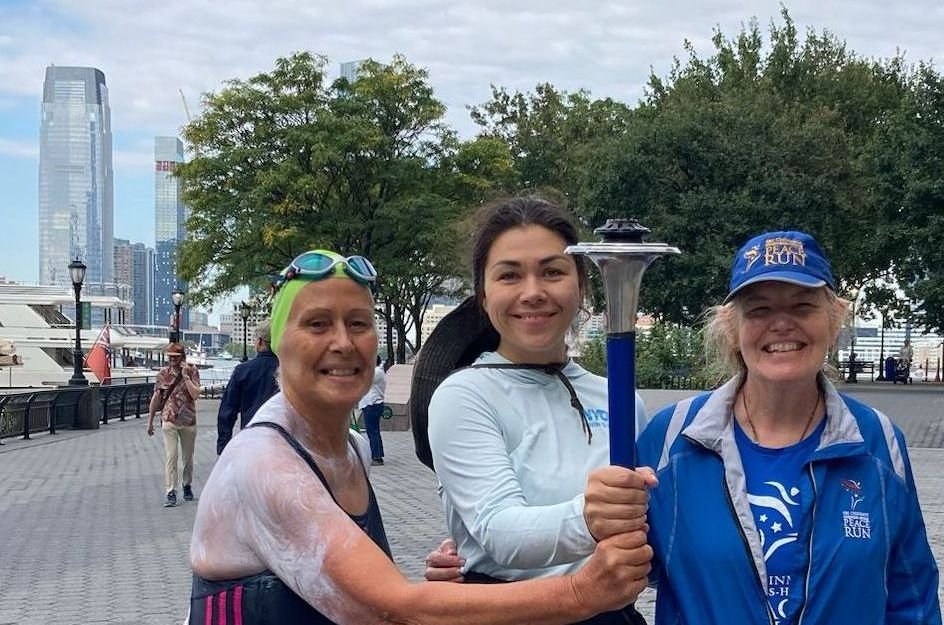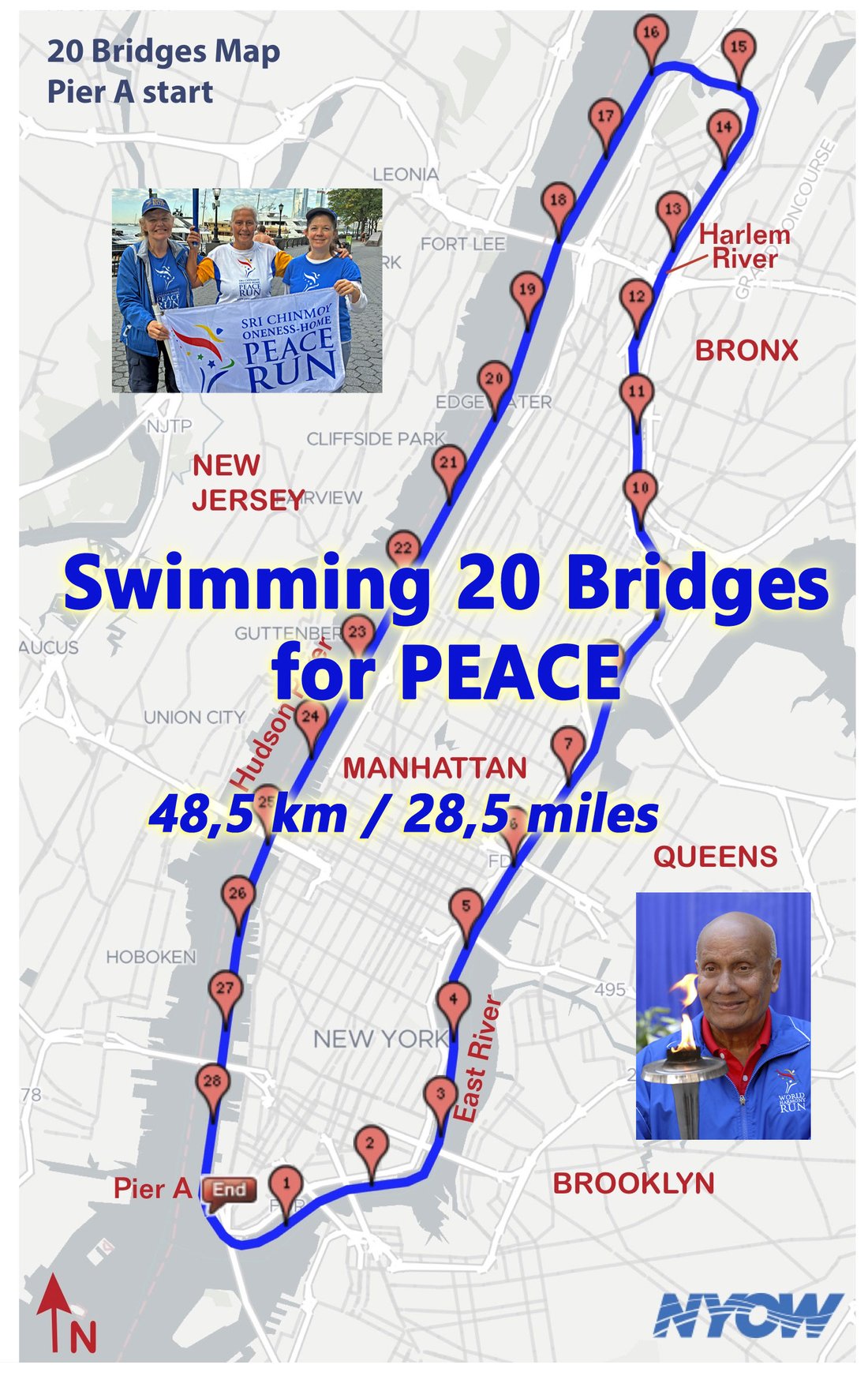 The torch has travelled 48.5 km from Swimming 20 Bridges around Manhattan for Peace to Start and Finish at Pier A, Lower Manhattan, N.Y..