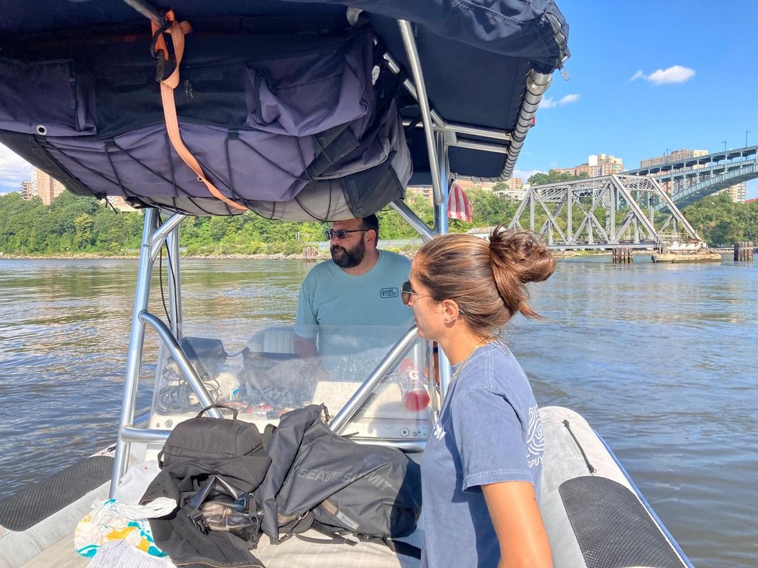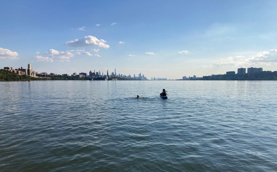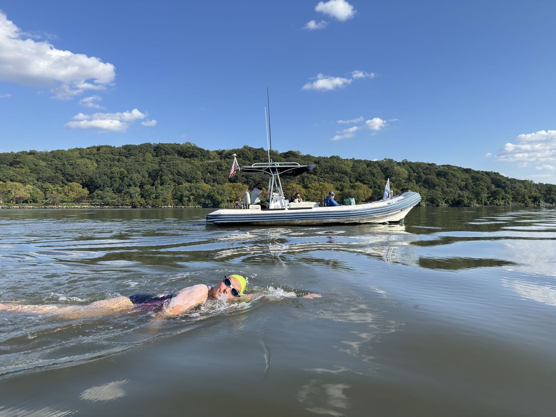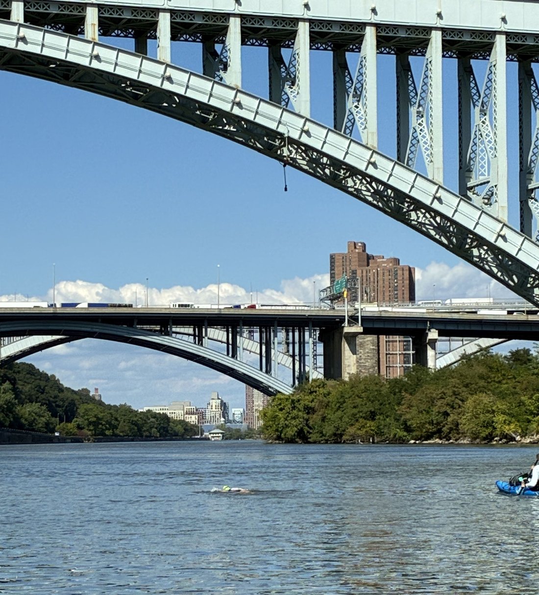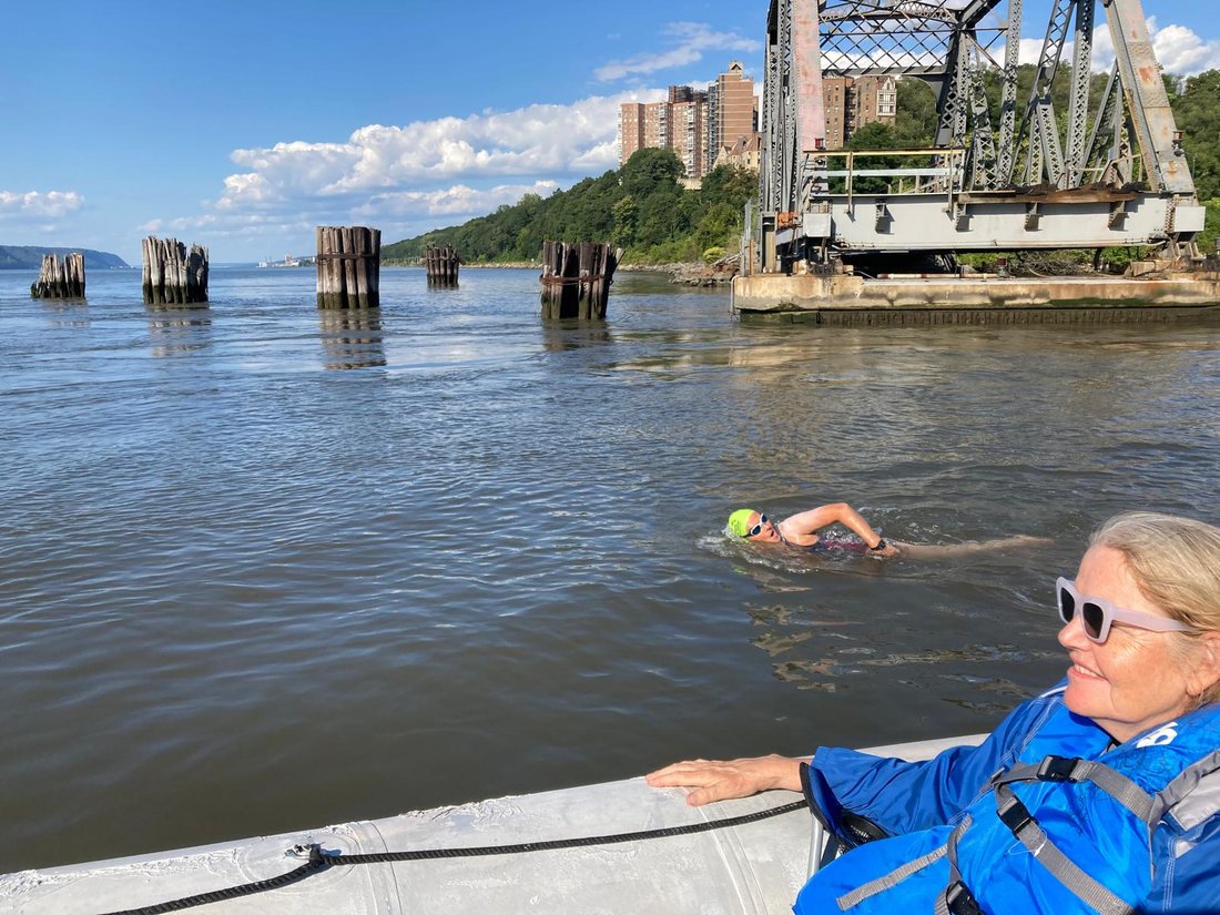 Toilet break for the boat crew while the kayak accompanies the swimmer - Henry Hudson bridge - no 18 - in view.