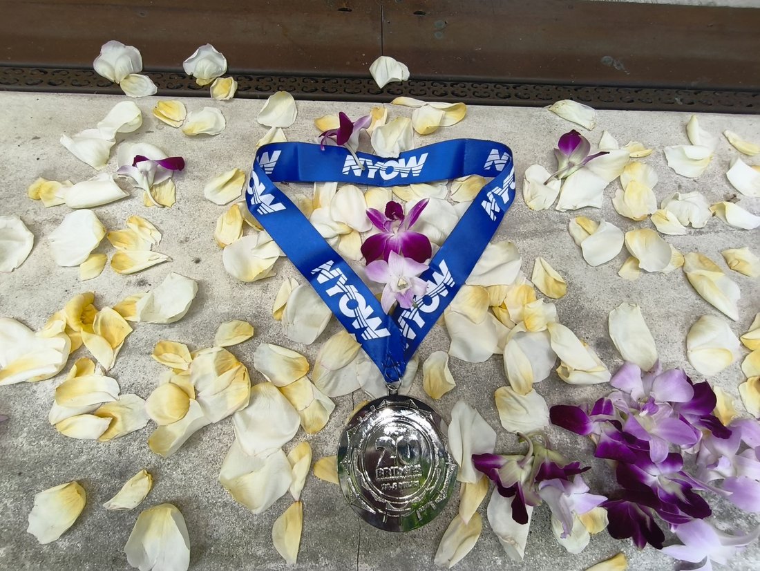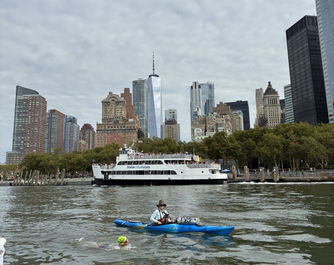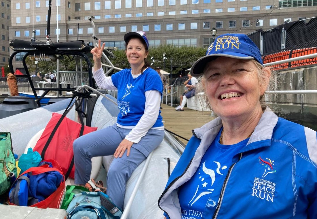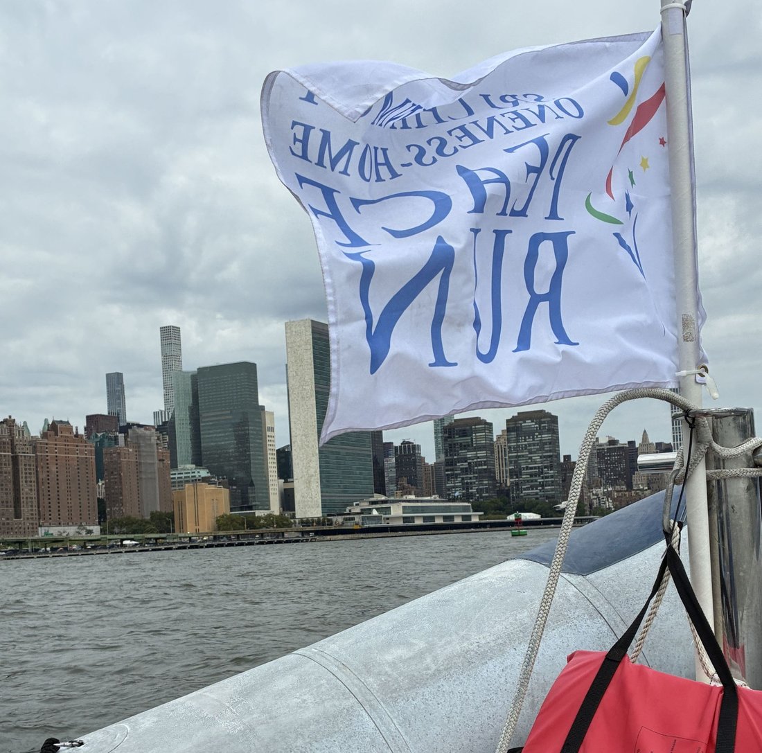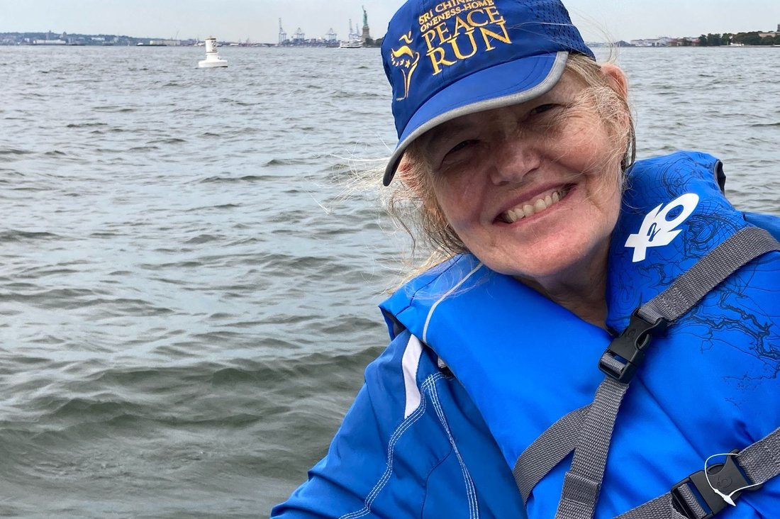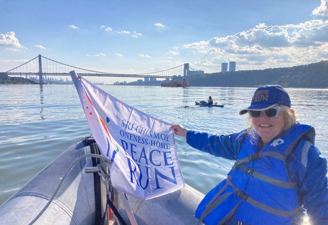 On Sept. 12, 2025, our Peace Run team member Vasanti (68) from Germany accomplished the iconic "20 Bridges" open water marathon swim around Manhattan Island, dedicating it to PEACE in honour of the United Nations 80th anniversary, the 55th year of Sri Chinmoy Peace Meditations at the United Nations and the International Day of Peace coming up on Sept. 21st. The Peace Torch of the Sri Chinmoy Oneness Home Peace Run was lit at the start and at the end and carried on the boat by her local boat crew Pipasa and Jamini. Her swim time was 9 hours 34 minutes, current-assisted. The swim is organised by New York Open Water (NYOW), who provide the accompanying safety boat and kayak including pilot, observer and kayaker.