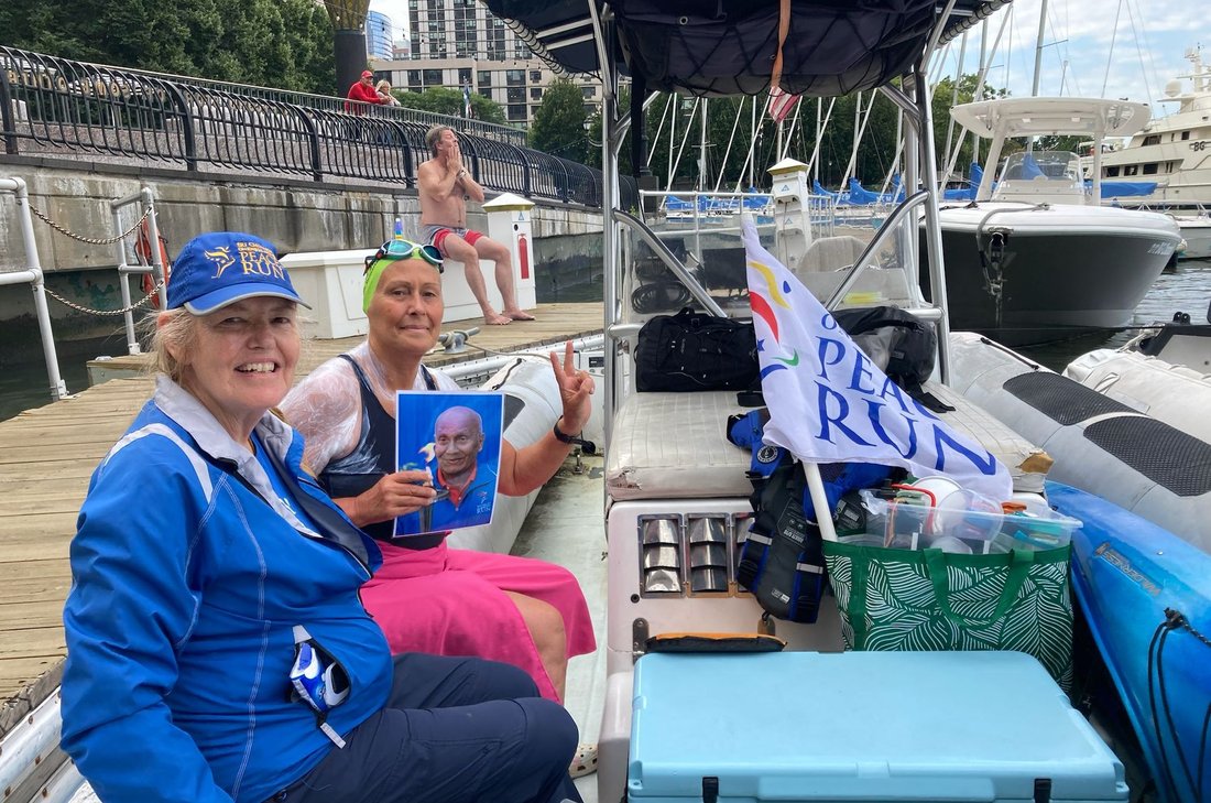 Boarding at the North Cove Marina for the swim start at Pier A. Sri Chinmoy (1931-2007), founder of the Peace Run, will be with us in spirit.