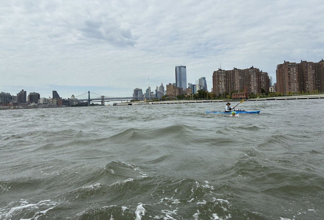 Second bridge - Manhattan Bridge - and choppy waters with wind against current for the first 2,5 hours or so, as expected. Luckily no hold-up by ferries or other boats.