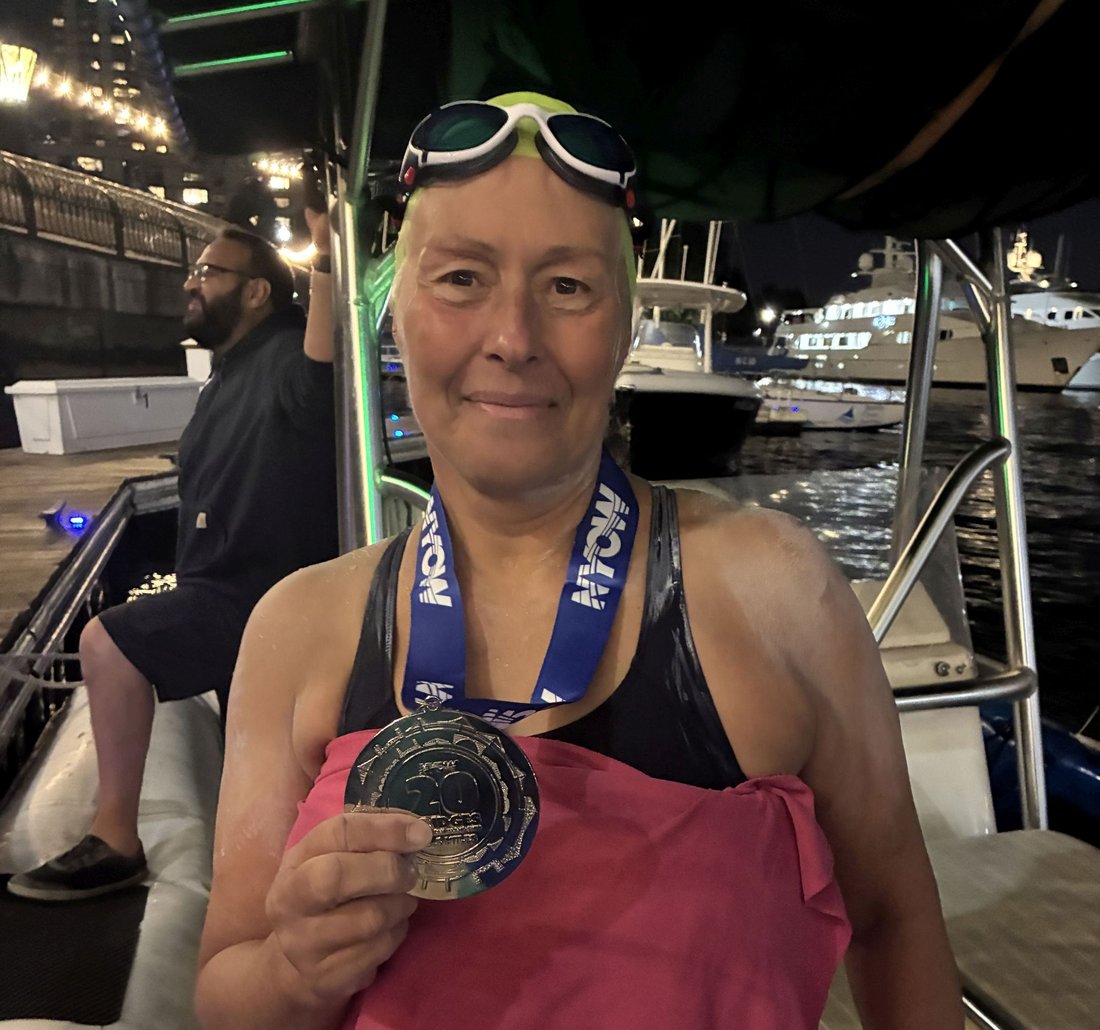 It was Vasanti's longtime dream to swim around Manhattan, but for a slower swimmer it became only possible recently, with separate starts now in smaller groups of similar speed and the start time adjusted accordingly to the tidal currents, so the swim would be mostly current-assisted. It was very special for her to swim in honour of the UN anniversary and at the same time celebrate a personal 40th anniversary of her first English Channel swim of Sept. 9, 1985.