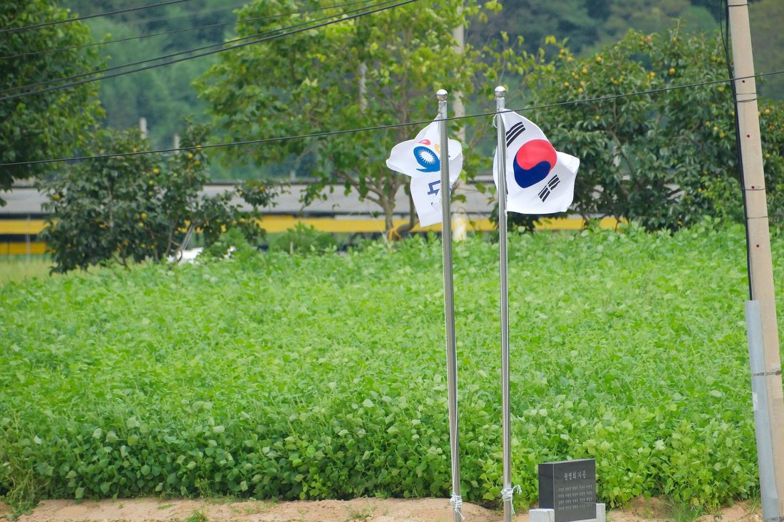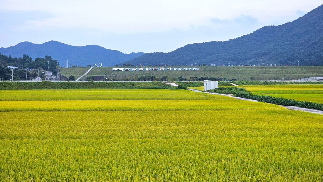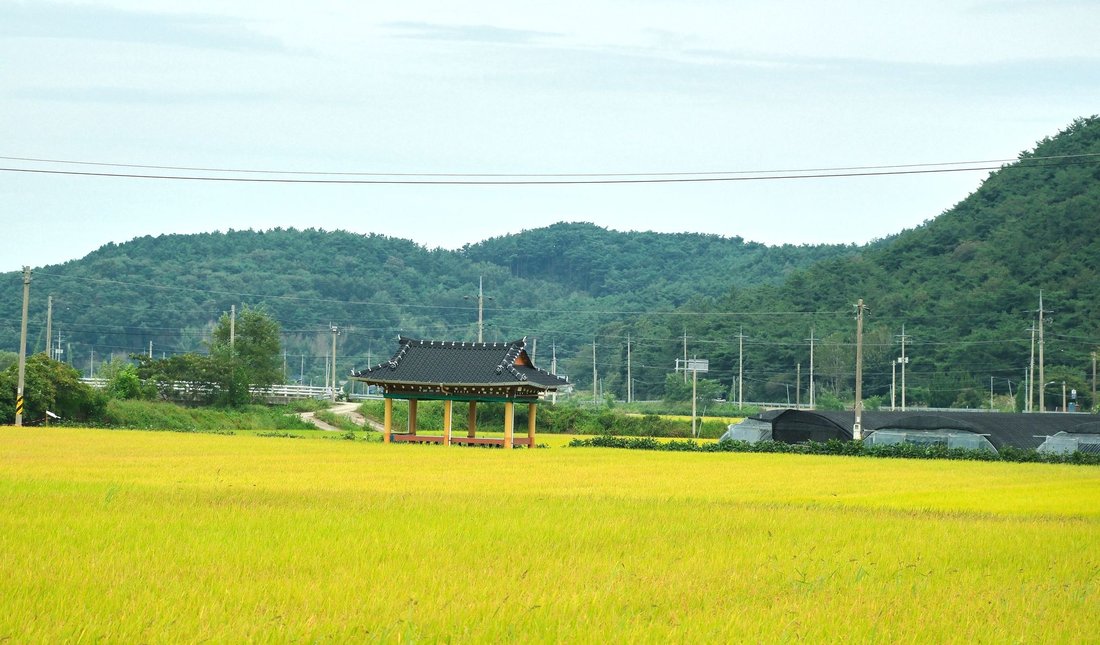 전신주, 정자, 황금들판  현대와 과거의 잔재의 공존