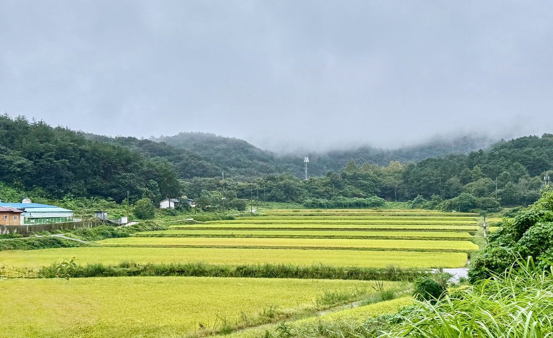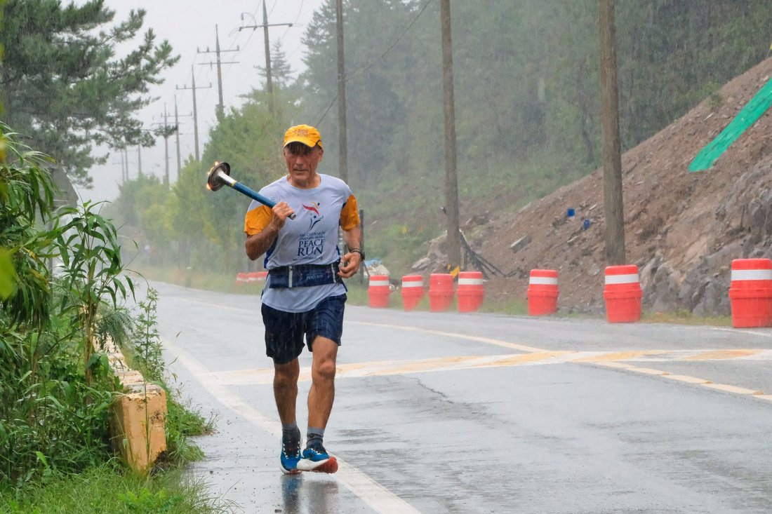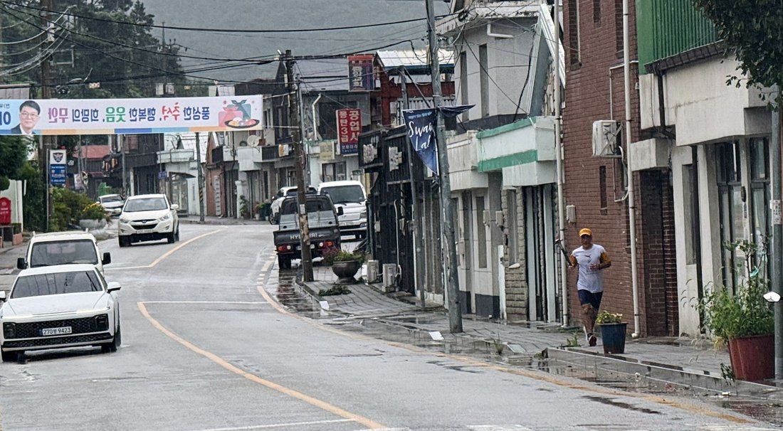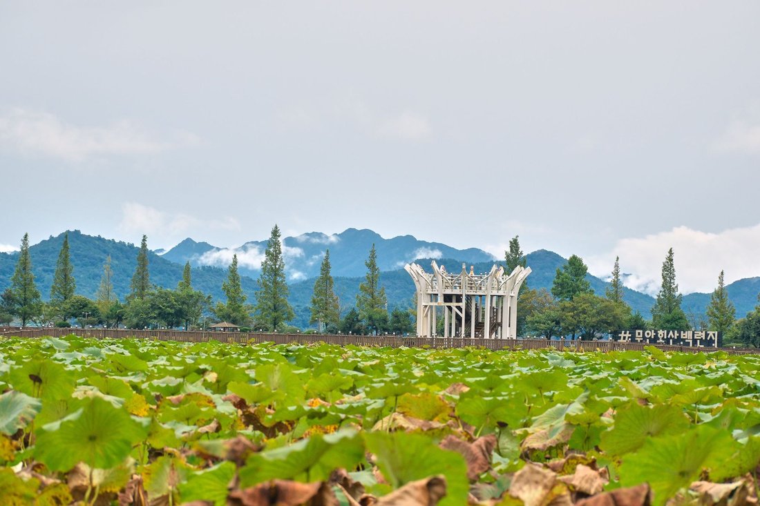 Running through the still falling rain to Baekryeonji (white lotus) Pond in Hoesan