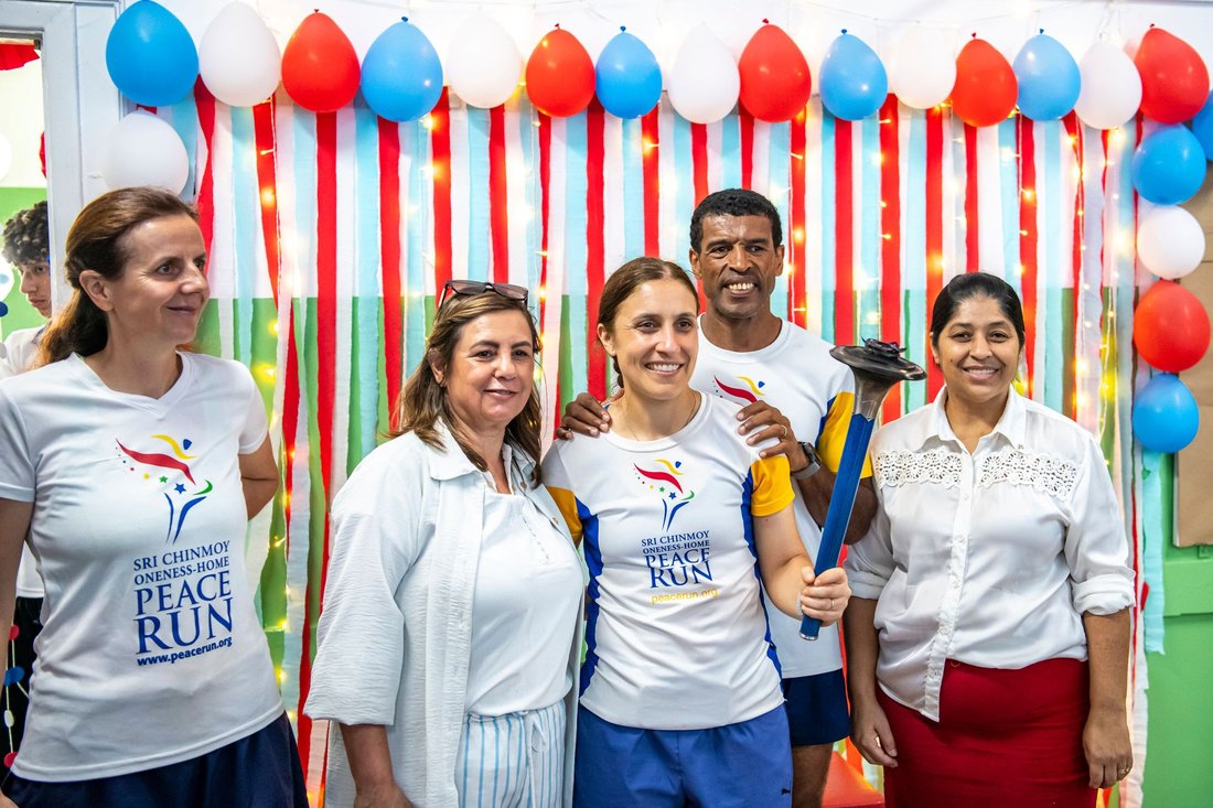 The school principal, Domingos Junior, received the Peace Torch and the Peace Run Certificate, reaffirming the school’s commitment to building a better world. We also gifted him a Jharna Kala painting by Sri Chinmoy, founder of the Peace Run, titled “World Harmony”.