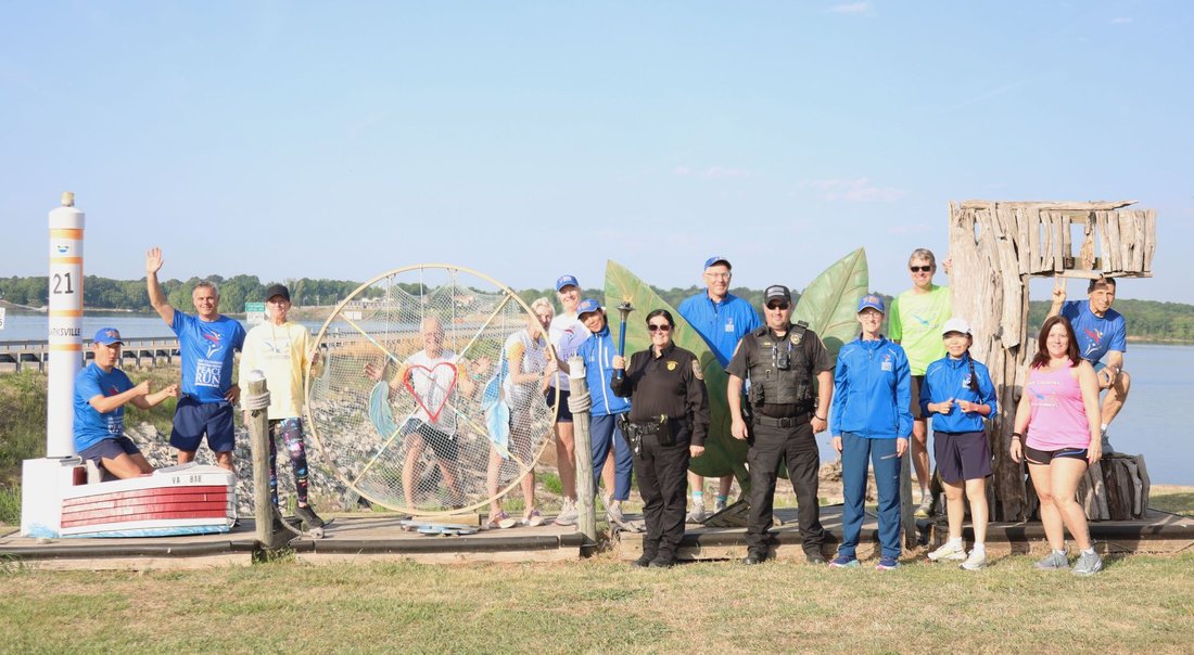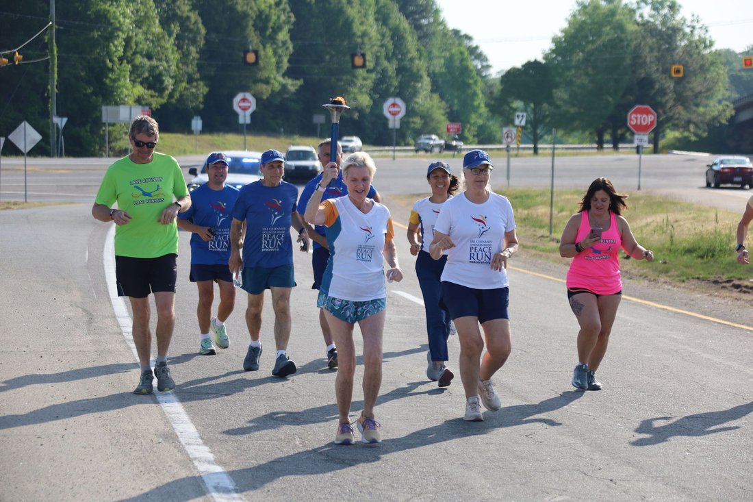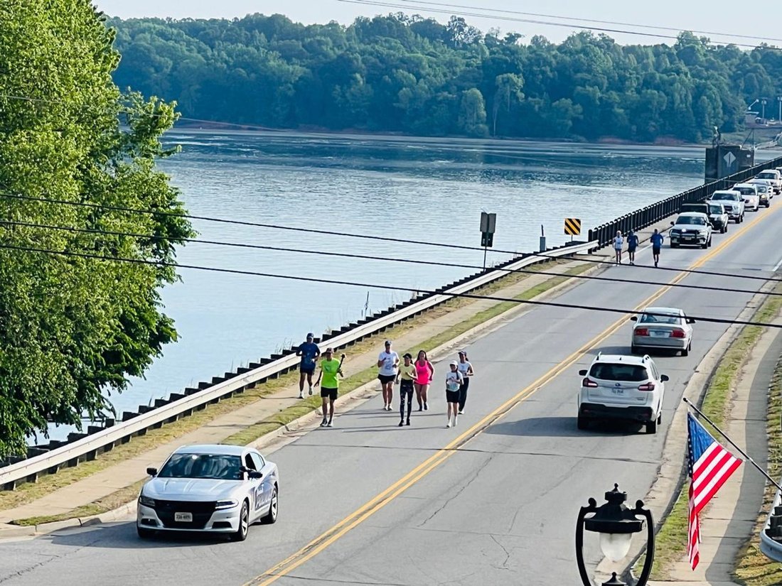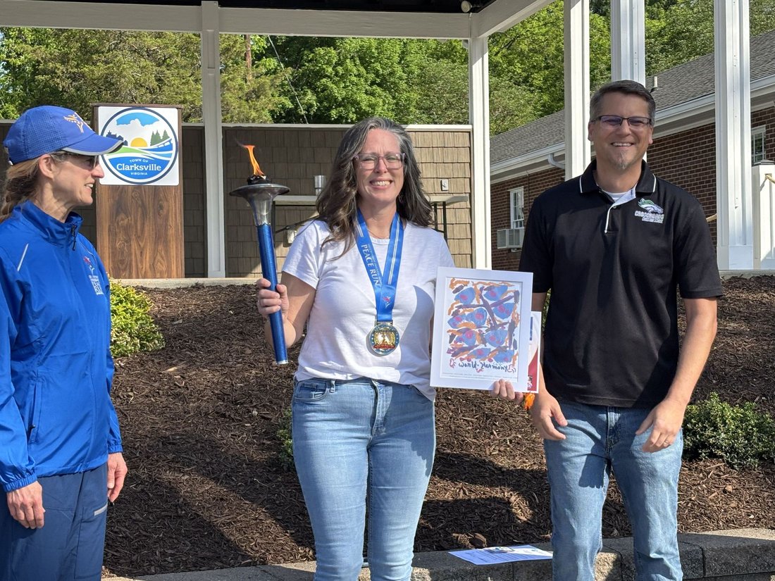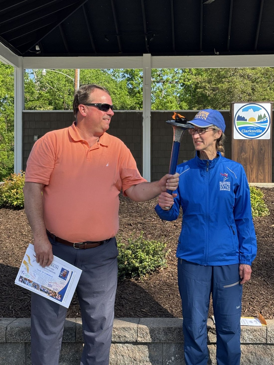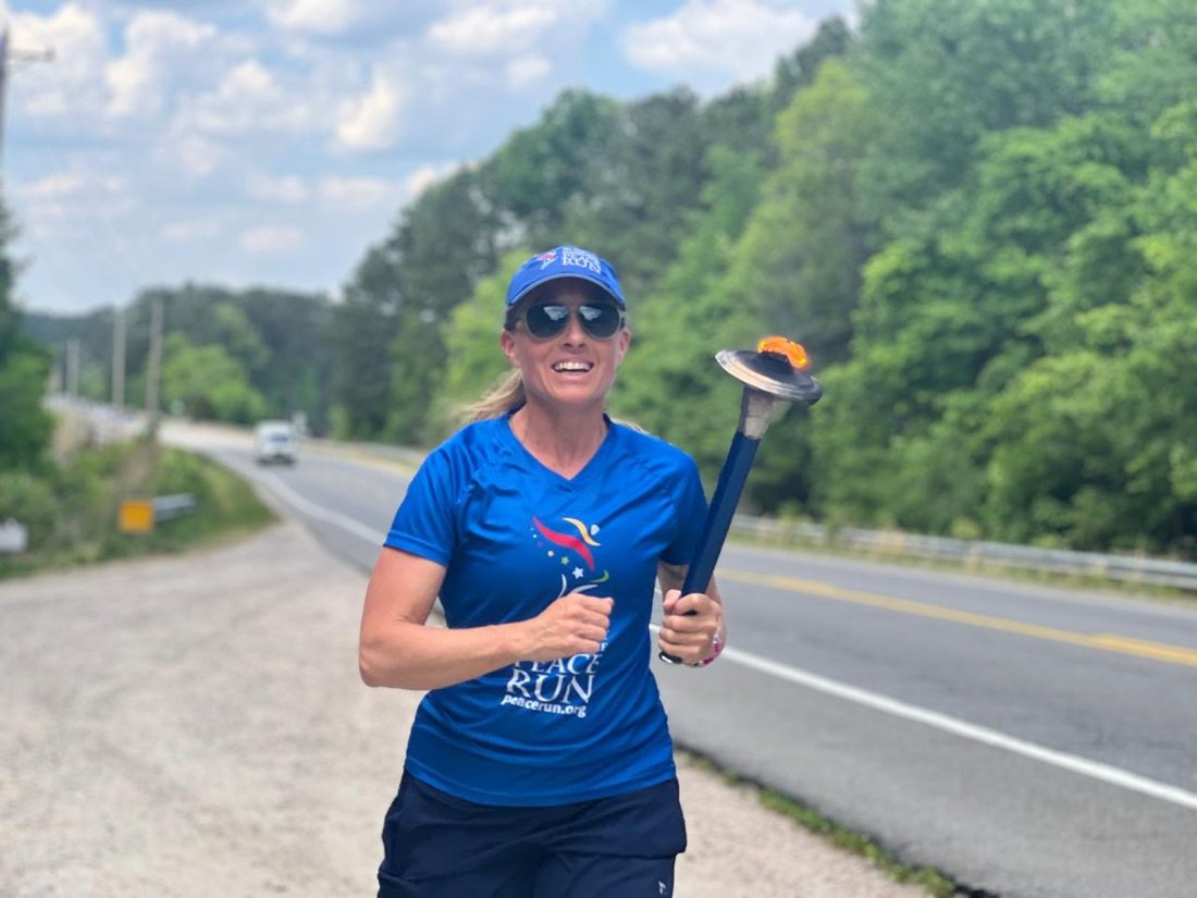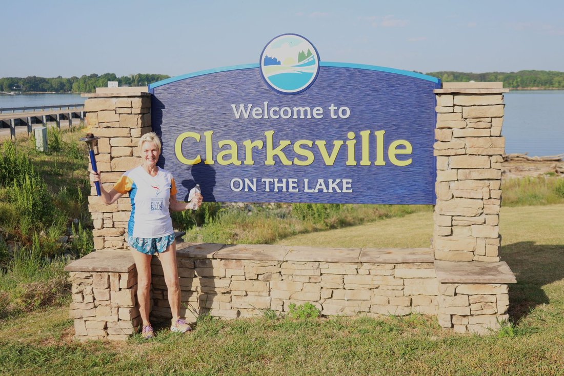 Getting ready to run into Clarksville with the Lake Country Road Runners Club. Officer Wendy Wooton holds the Peace Torch.