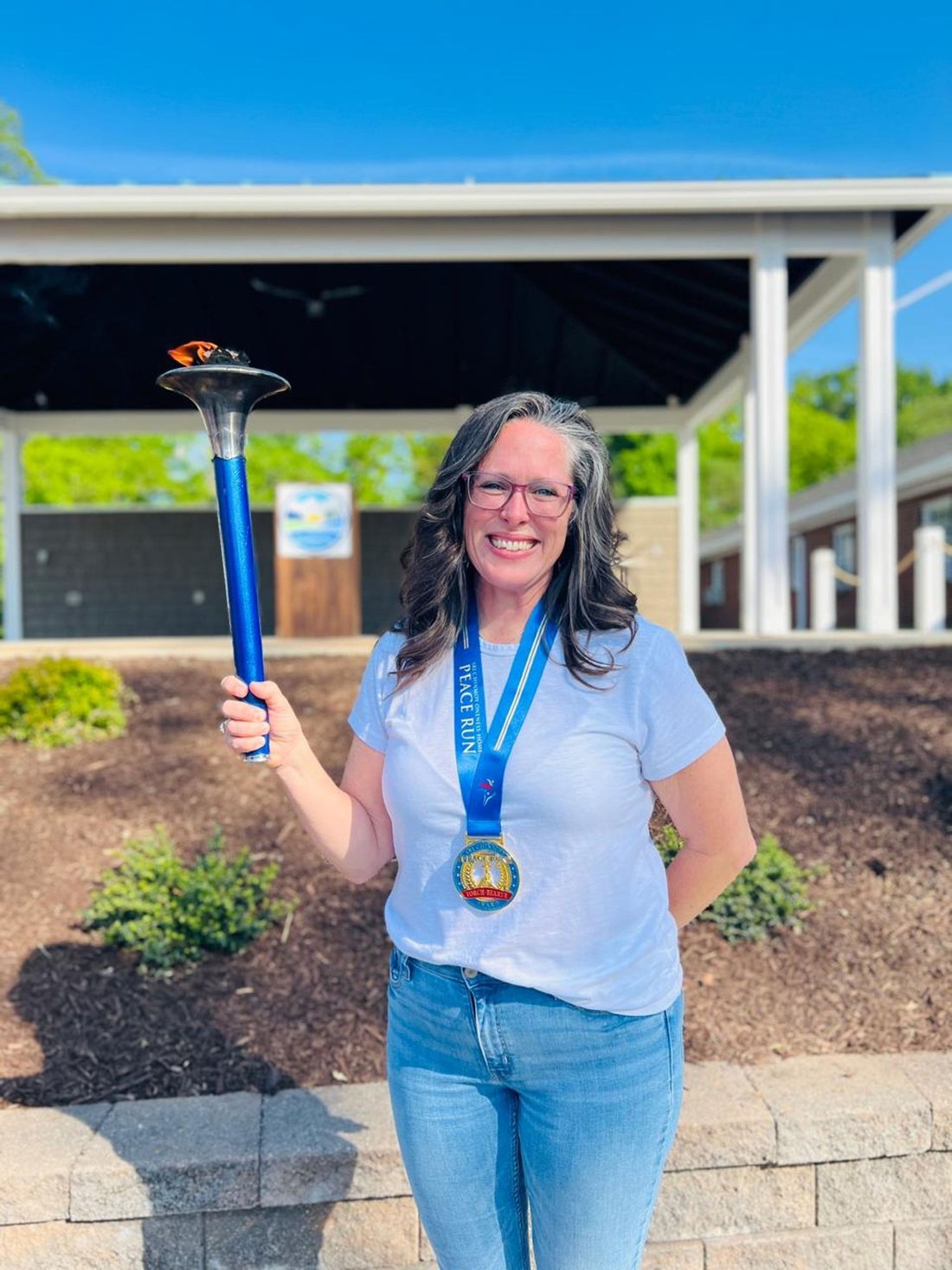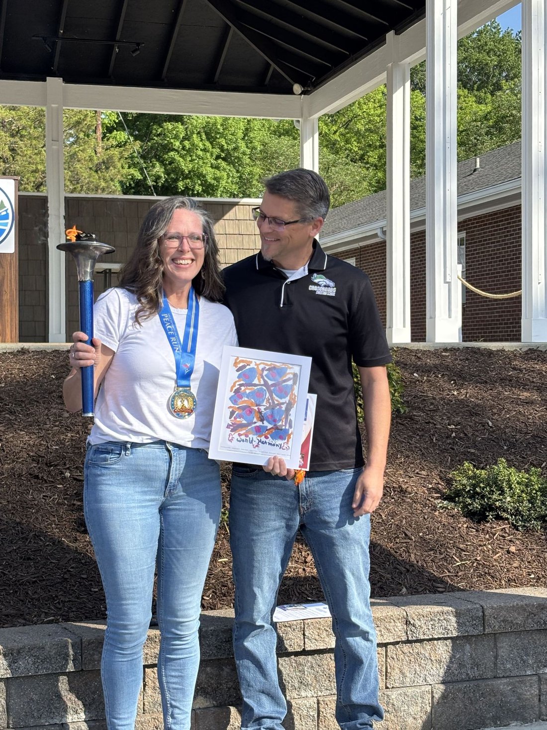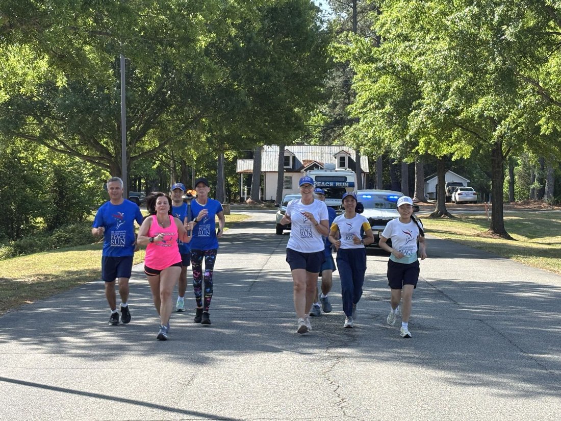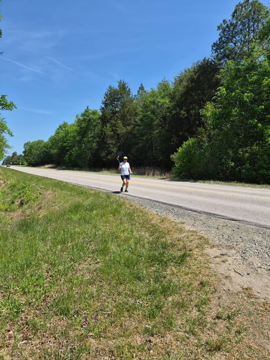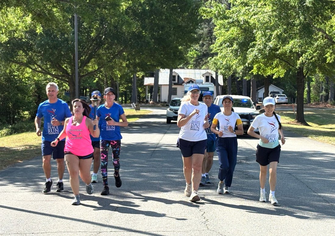 Getting ready to run into Clarksville with the Lake Country Road Runners Club. Officer Wendy Wooton holds the Peace Torch.