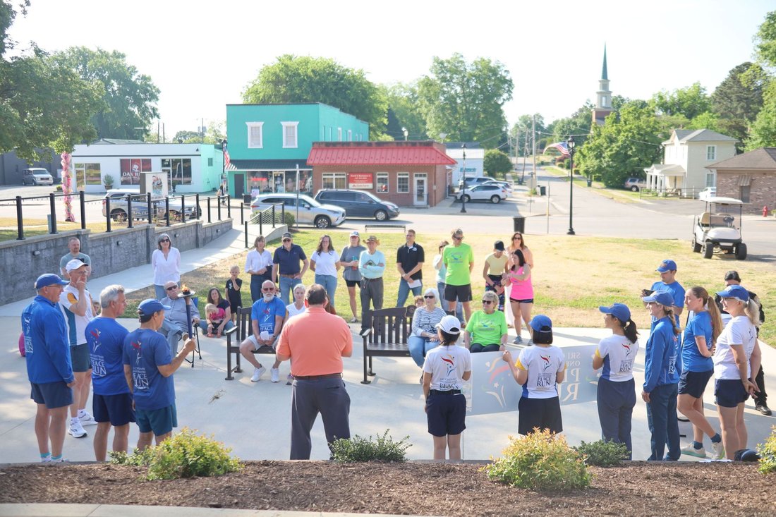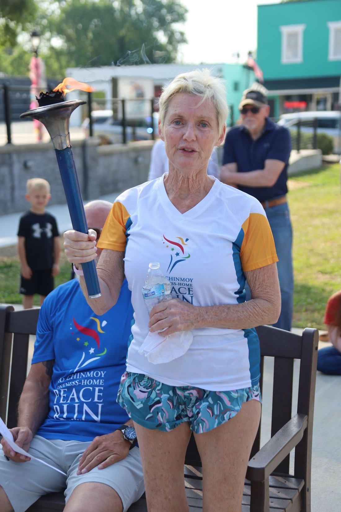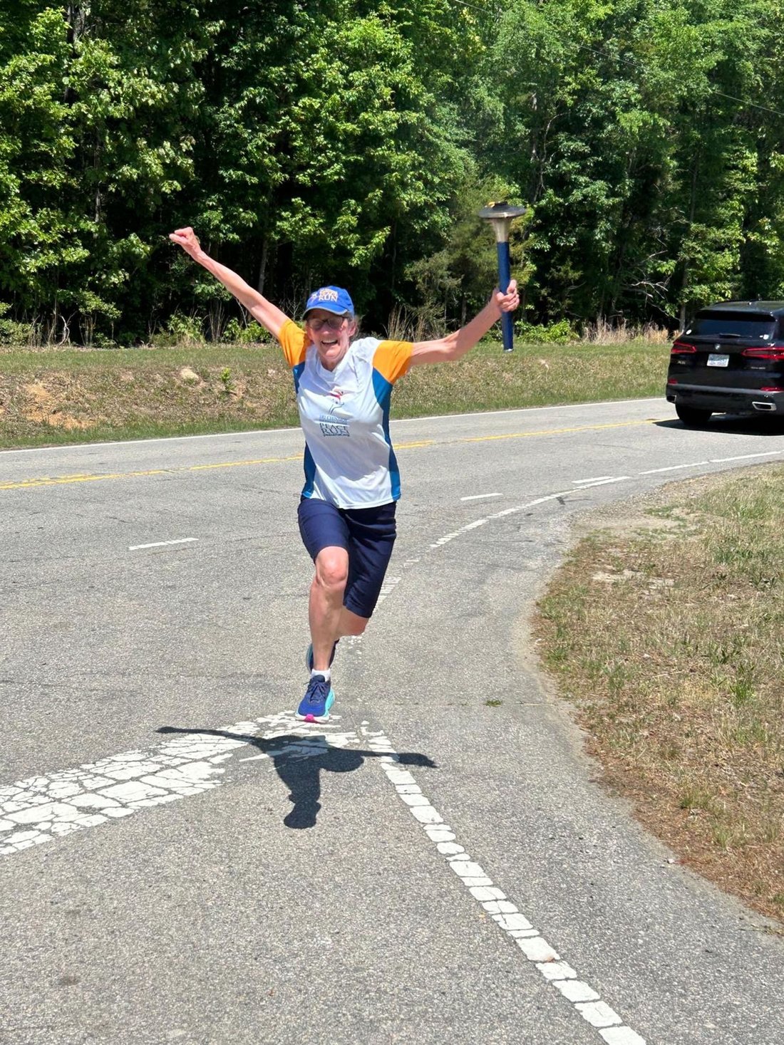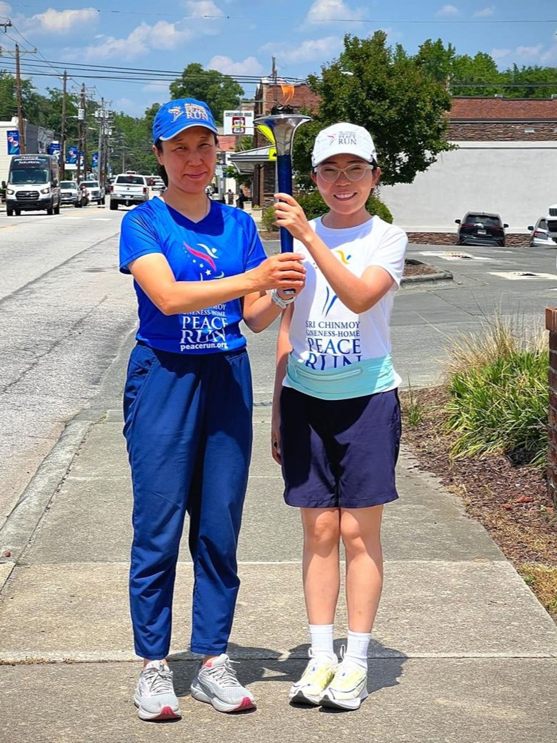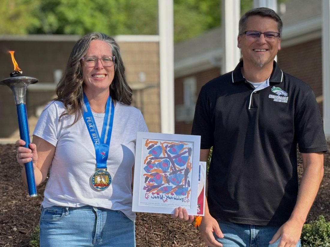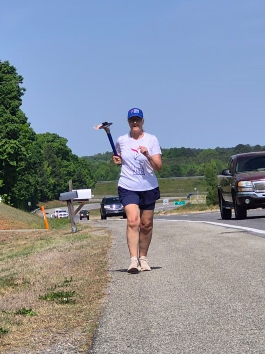 Getting ready to run into Clarksville with the Lake Country Road Runners Club. Officer Wendy Wooton holds the Peace Torch.