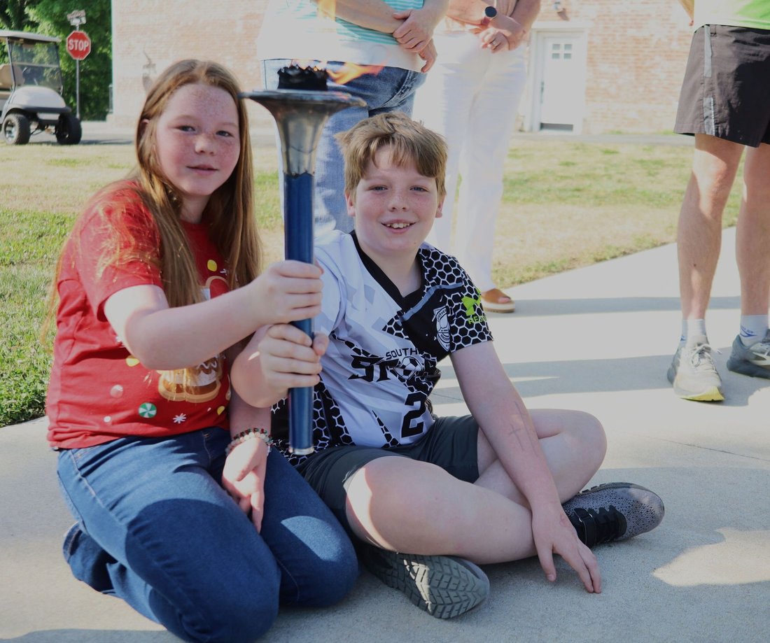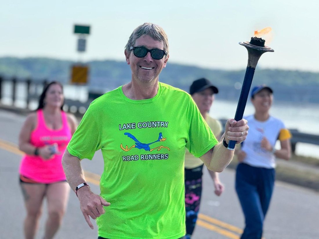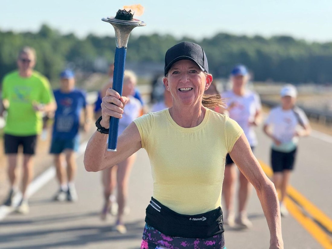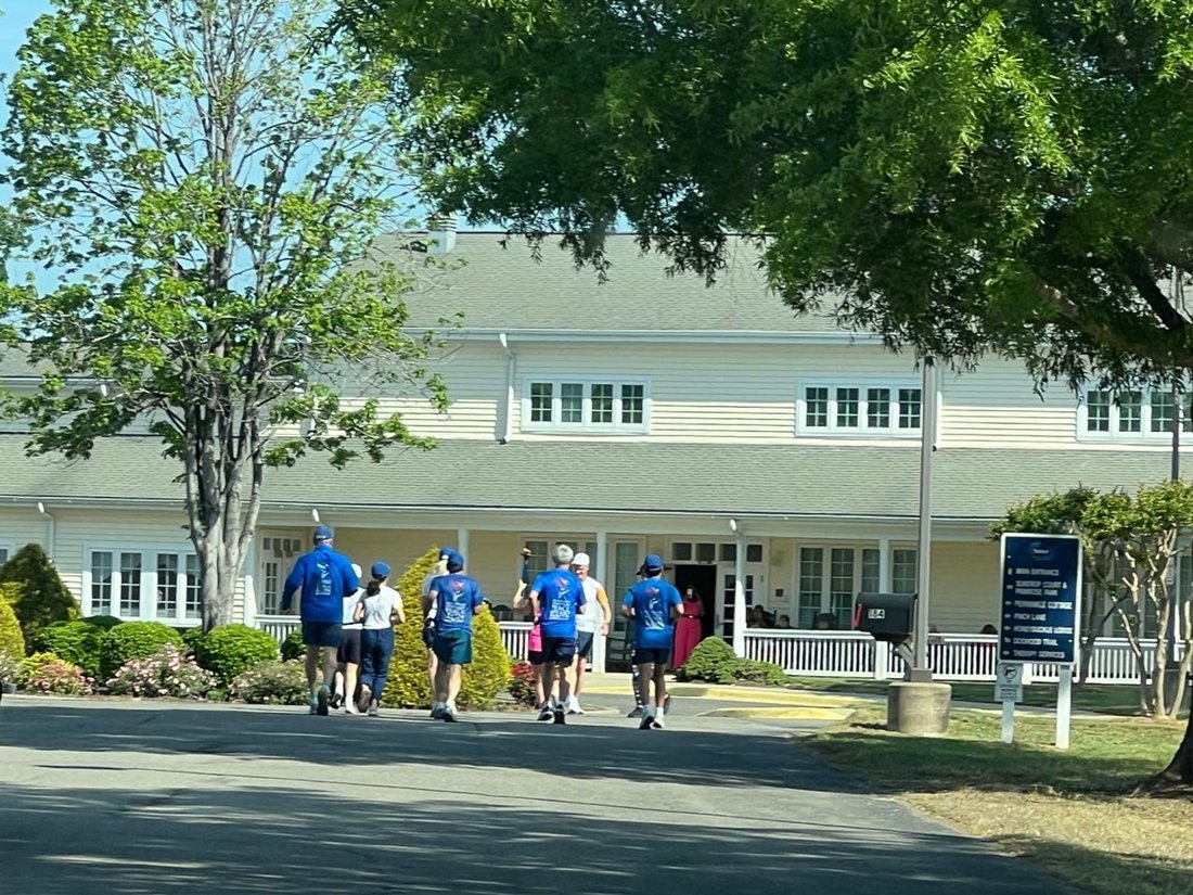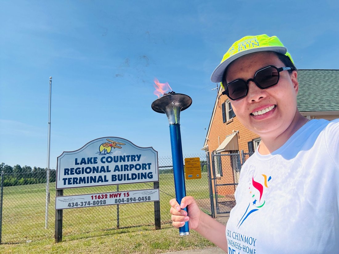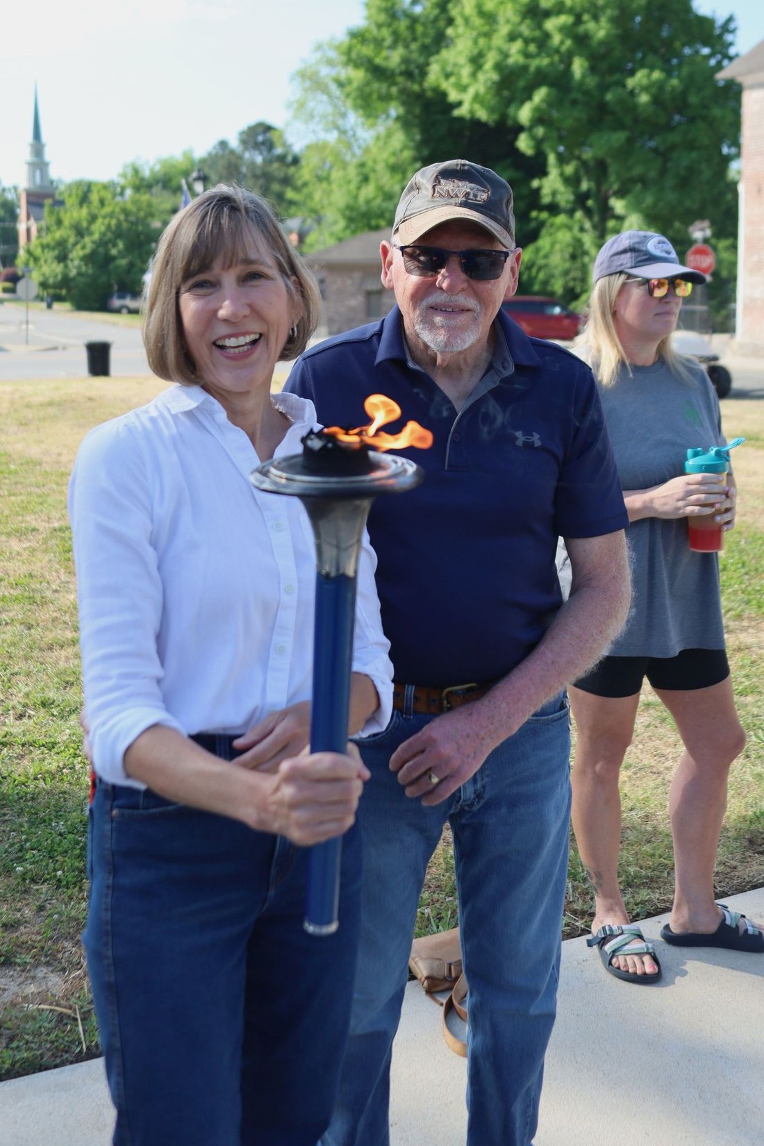 Getting ready to run into Clarksville with the Lake Country Road Runners Club. Officer Wendy Wooton holds the Peace Torch.