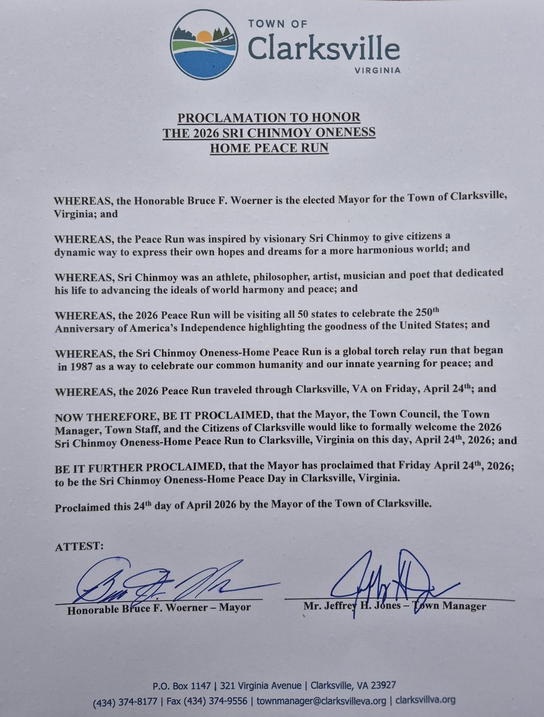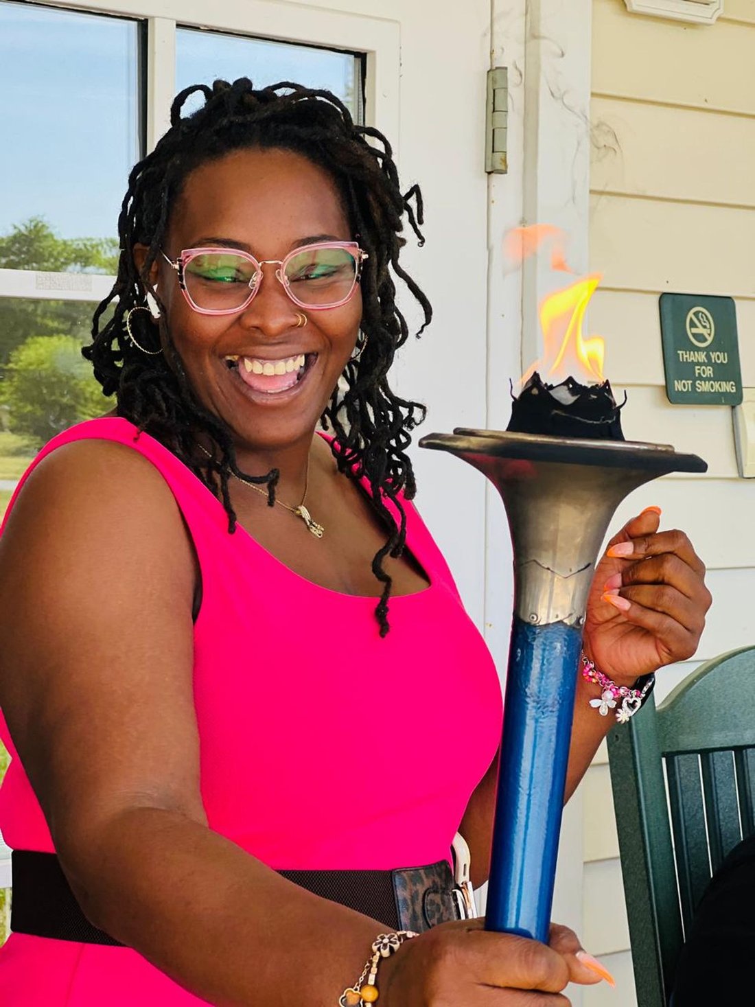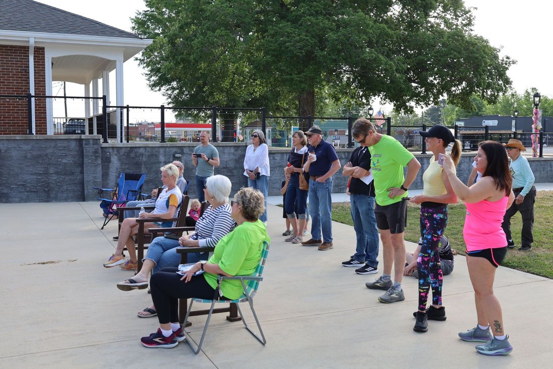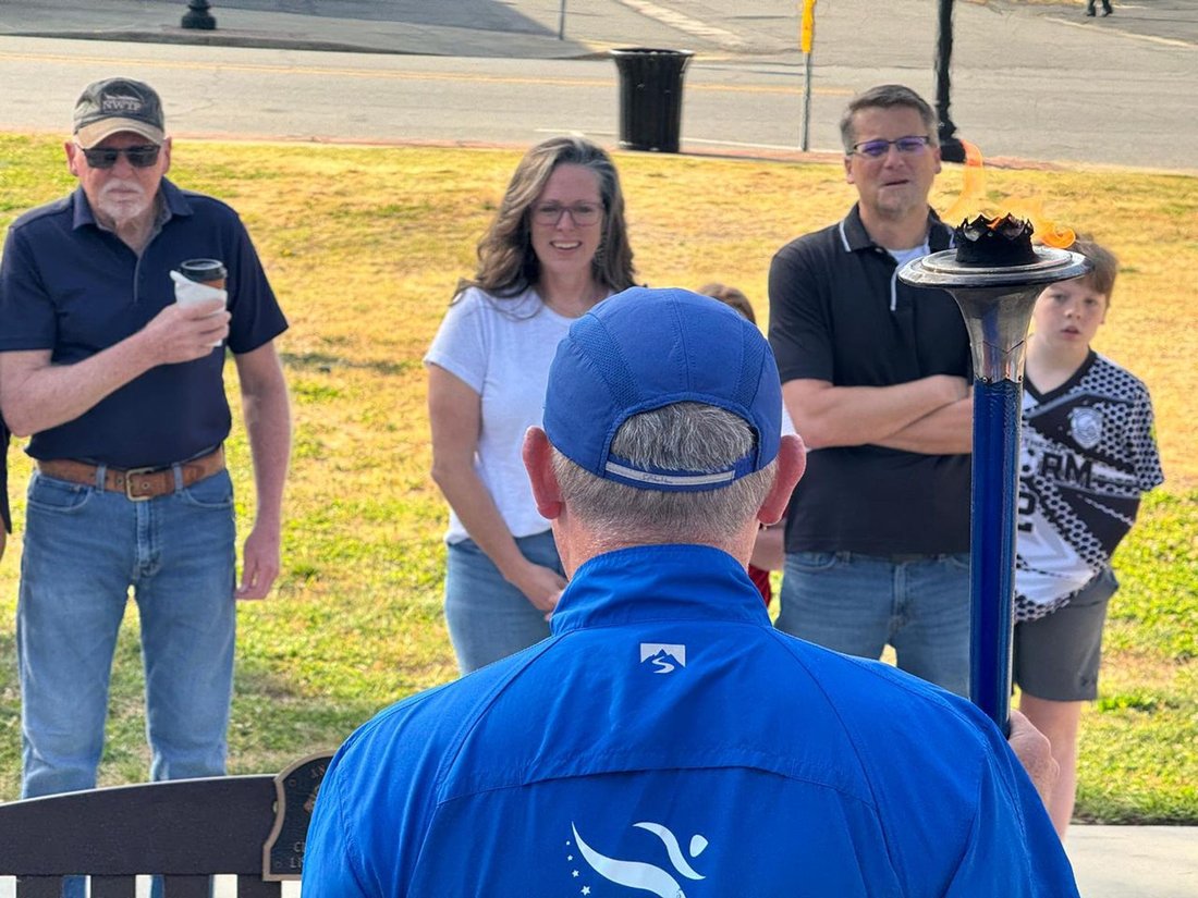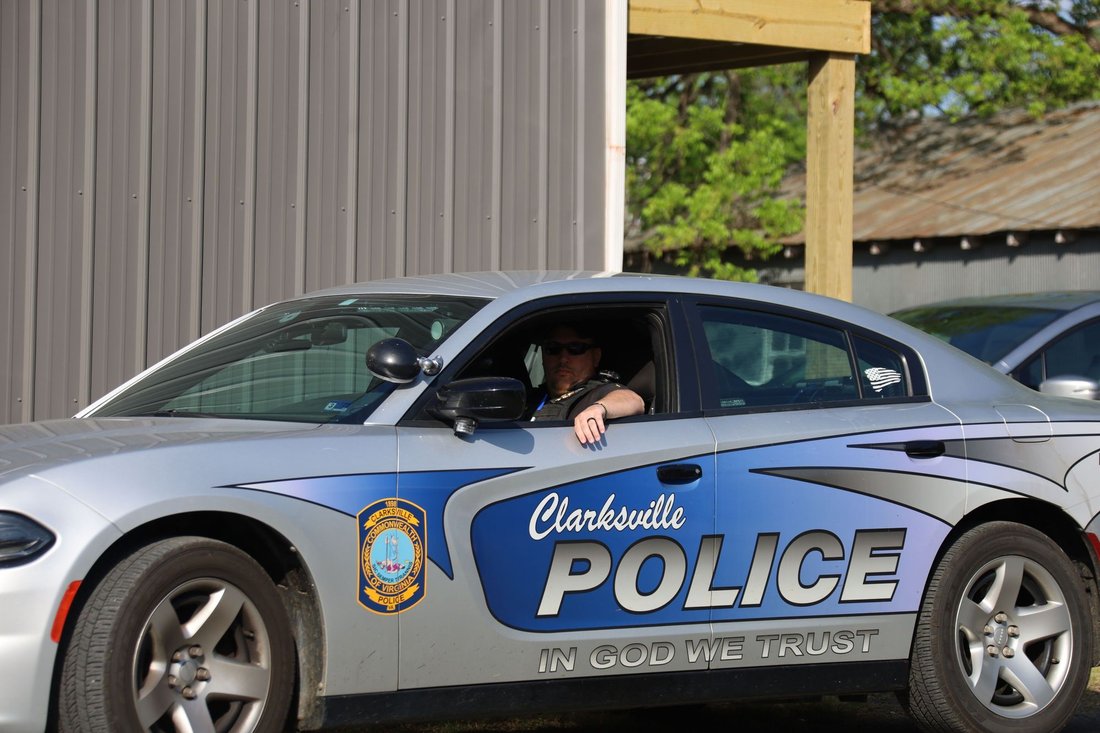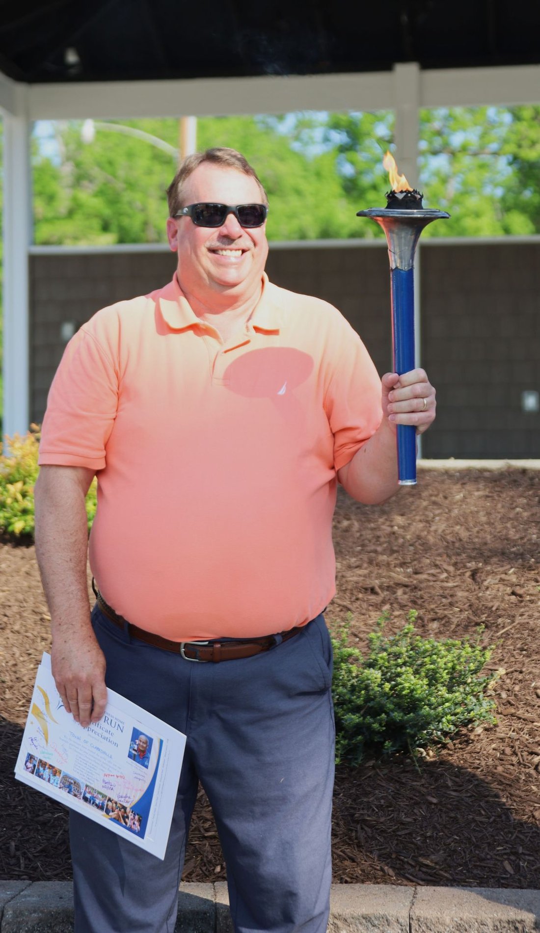 Getting ready to run into Clarksville with the Lake Country Road Runners Club. Officer Wendy Wooton holds the Peace Torch.