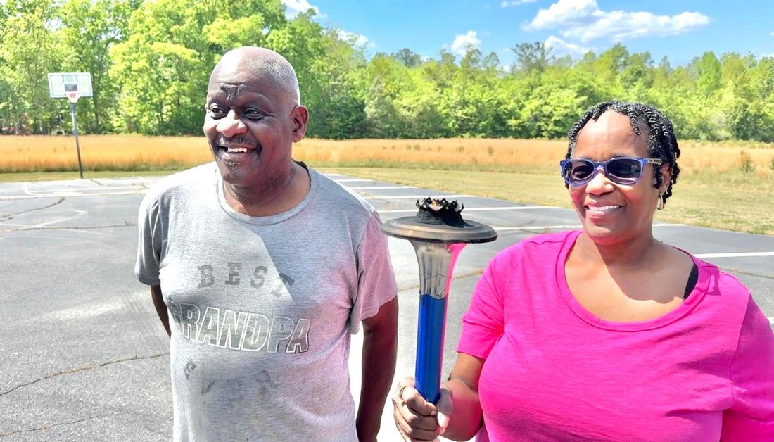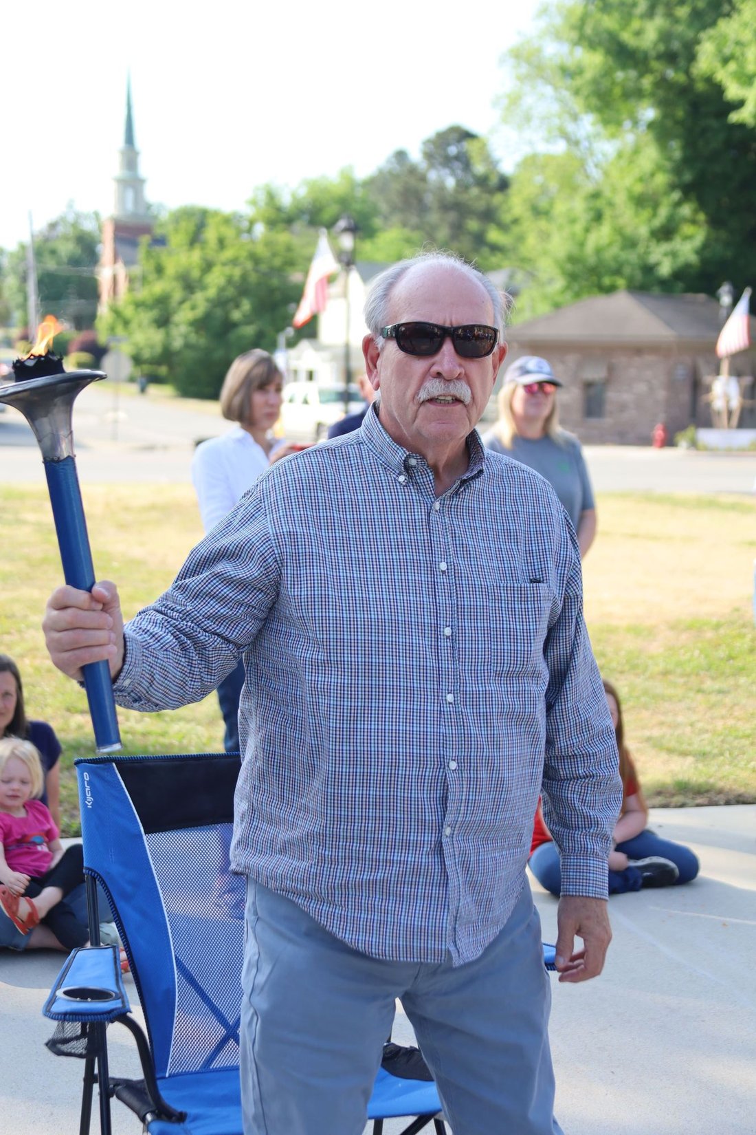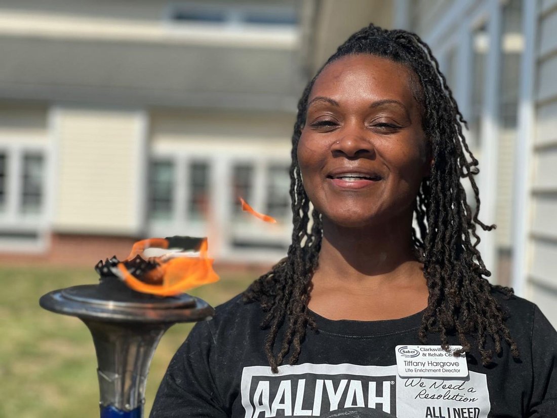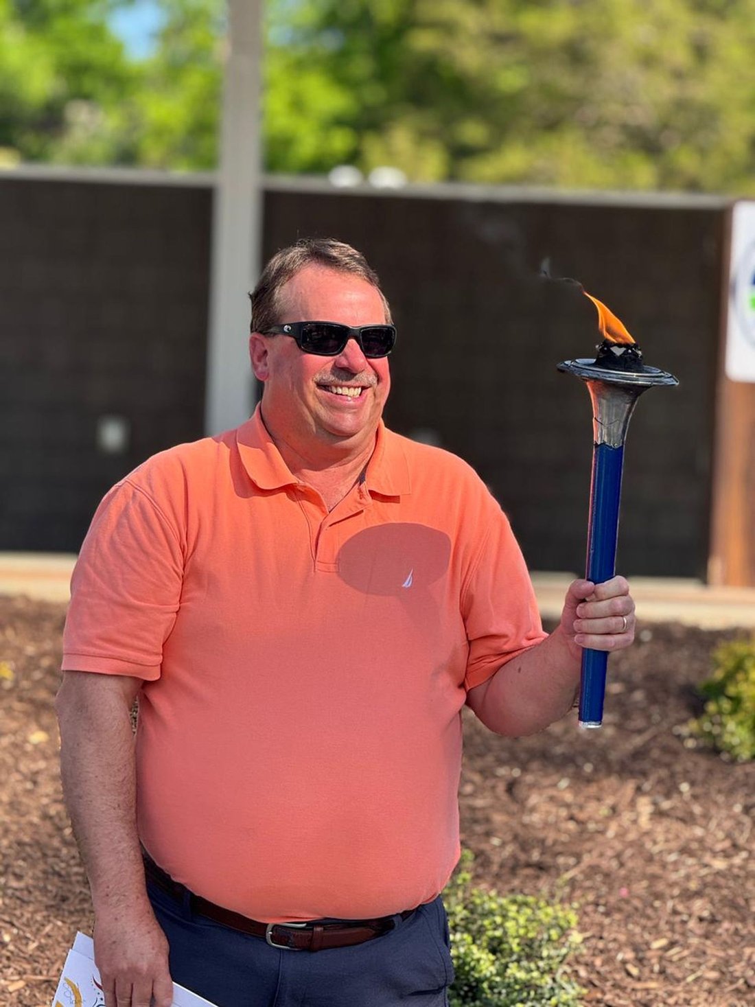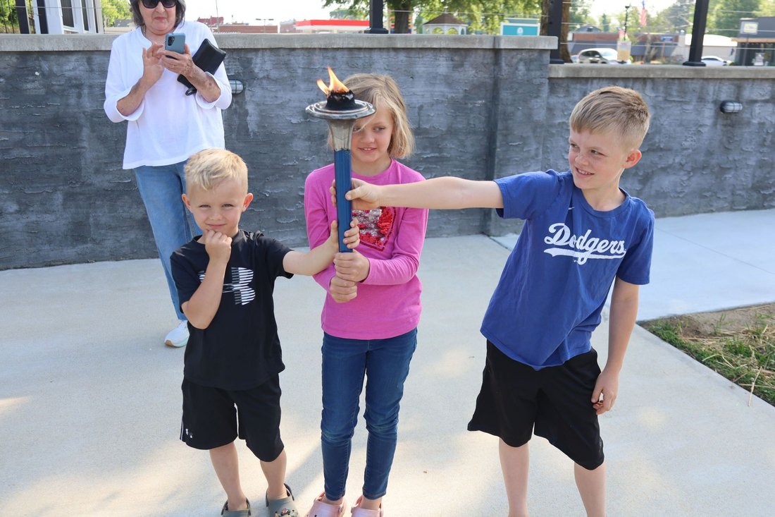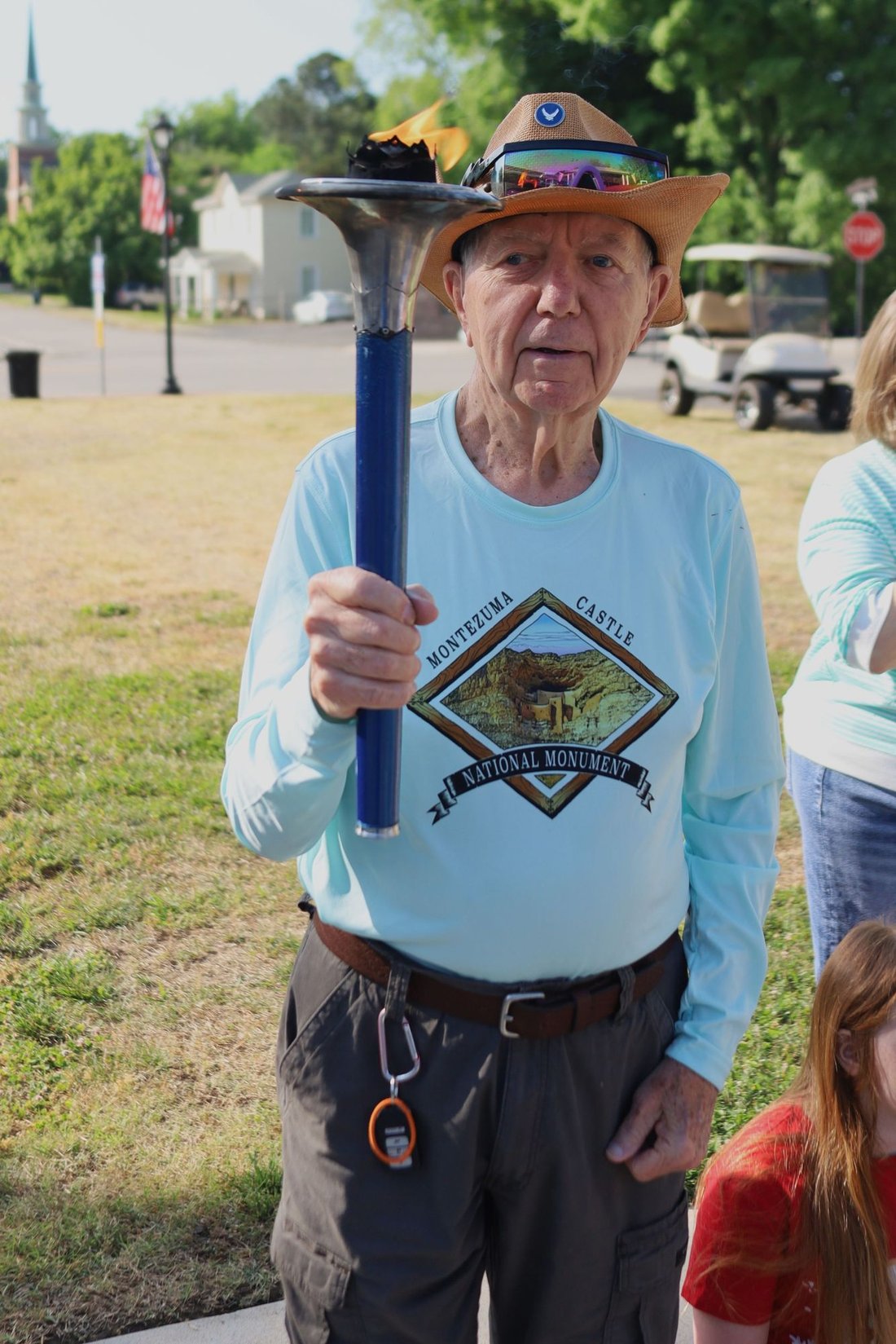 Getting ready to run into Clarksville with the Lake Country Road Runners Club. Officer Wendy Wooton holds the Peace Torch.