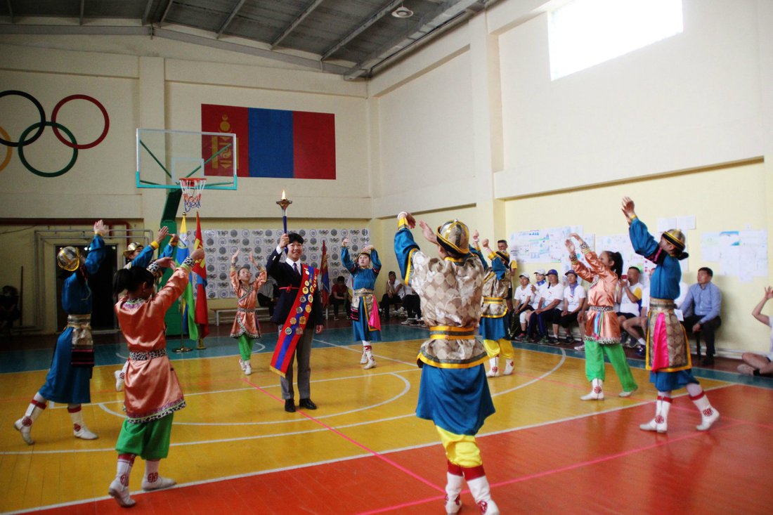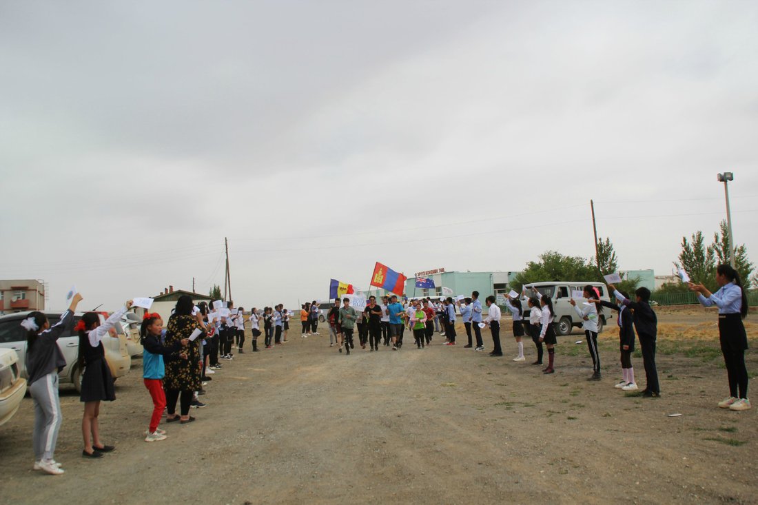 Ханхонгор сумын сурагчид эгнэн жагсаад Энхийн гүйгчдээ тосон авч байна.