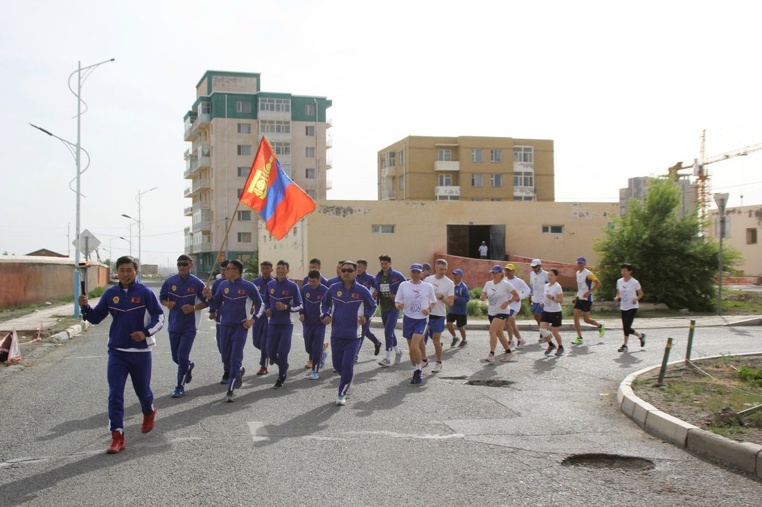 Өмнөговь аймгийн Ханхонгор сумынхан нутгийн зааг дээр Энхийн гүйлтийн хамт олонд Энхийн бамбараа хүлээлгэн өглөө.