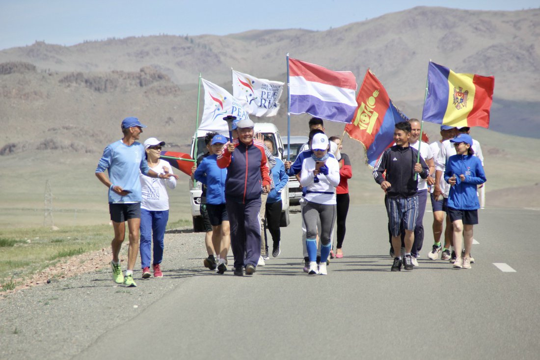 ОХУ-ын зочин гүйгч Денис Семенов Эвийн-Өргөө Энхийн Гүйлтийн Галт Бамбарыг буухиалан гүйсээр Завхан аймгийн Их-Уул сумынханд хүлээлгэн өглөө.