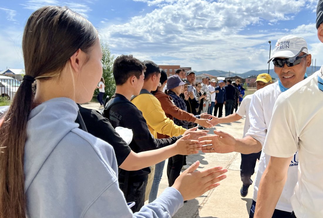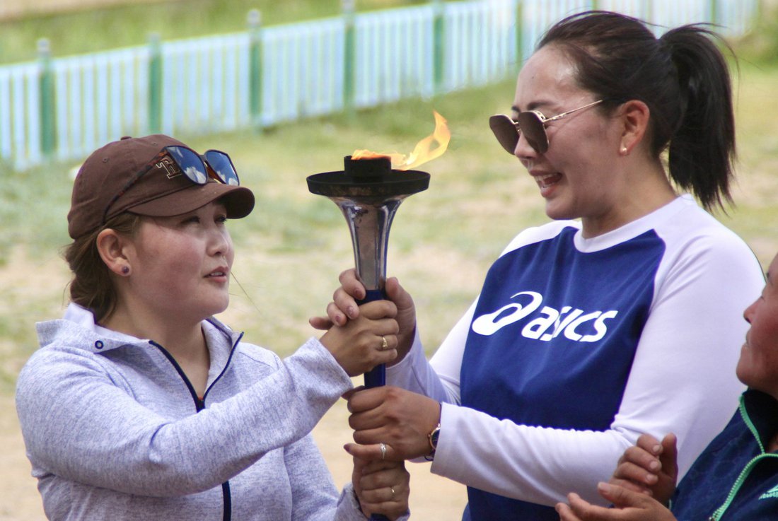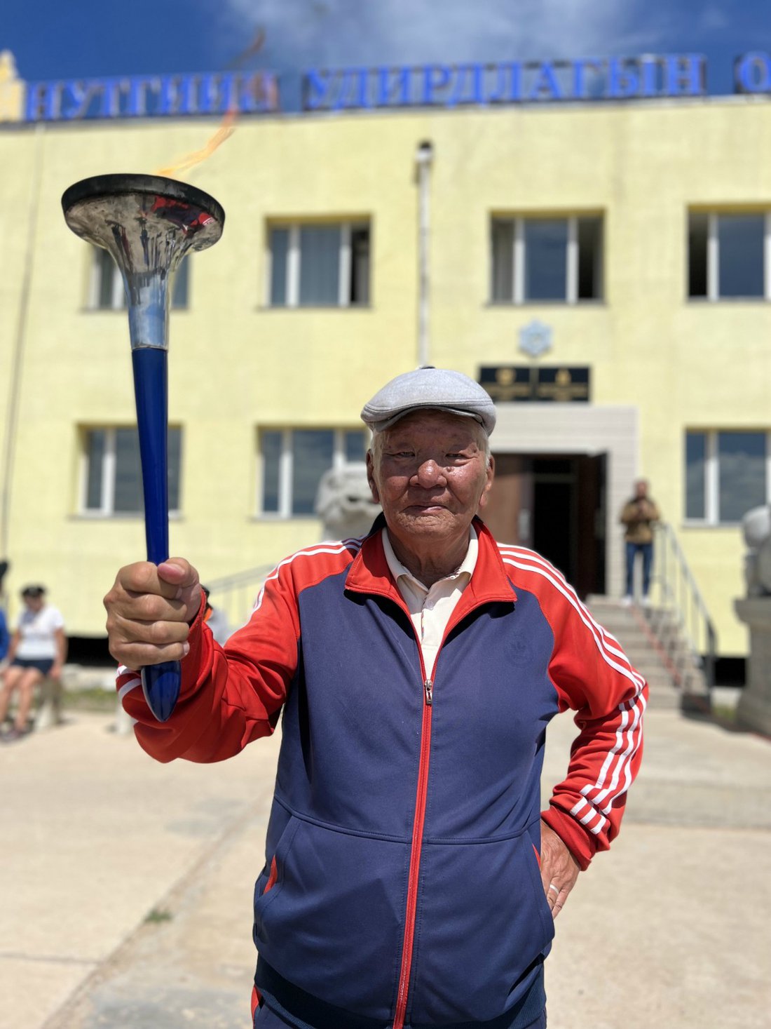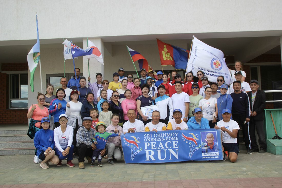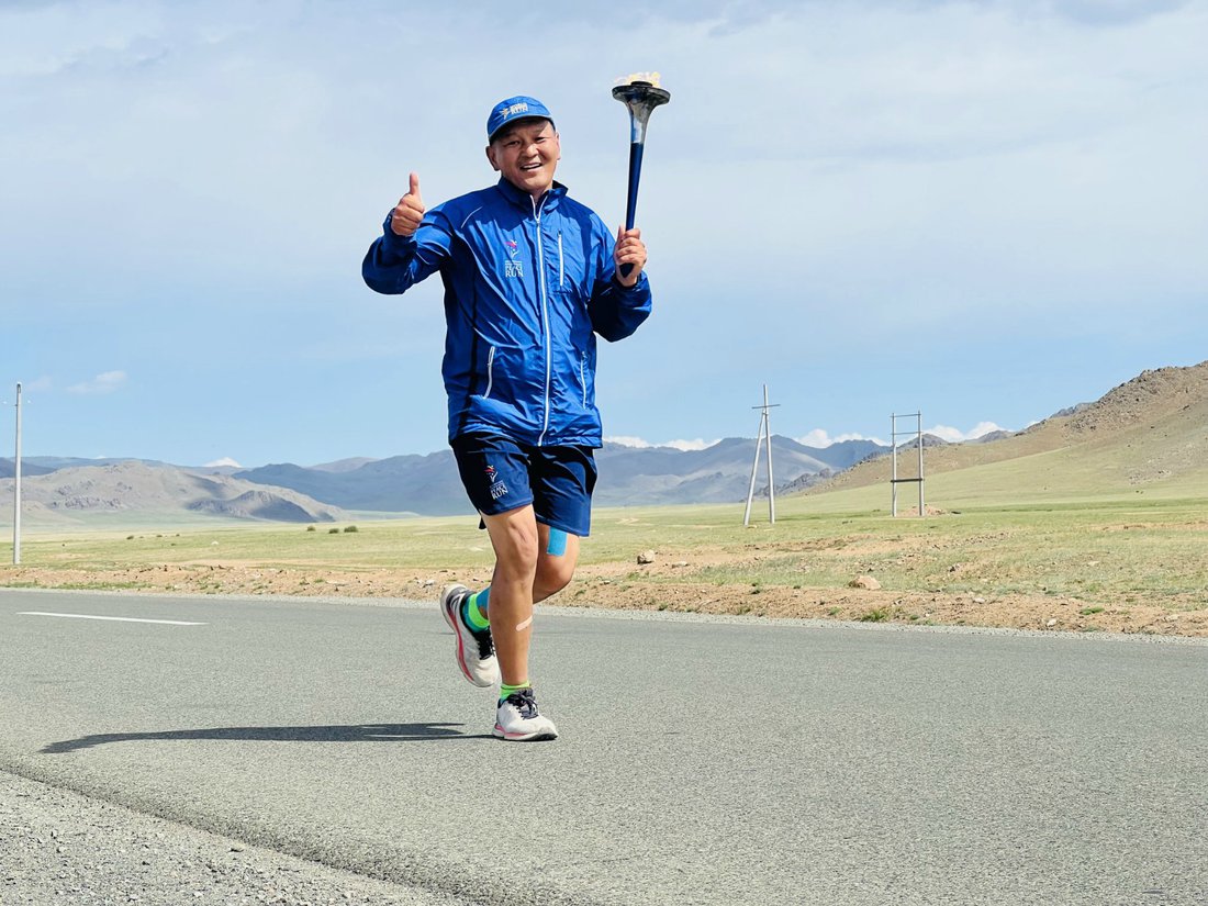 ОХУ-ын зочин гүйгч Денис Семенов Эвийн-Өргөө Энхийн Гүйлтийн Галт Бамбарыг буухиалан гүйсээр Завхан аймгийн Их-Уул сумынханд хүлээлгэн өглөө.