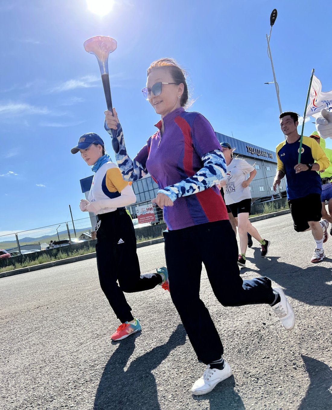 Эвийн-Өргөө Энхийн Гүйлтийн Багийн гишүүн Дархан-Уул аймгийн харъяат Мягмаржавын Оюунгэрэл Галт Бамбарыг буухиалан гүйлтийн замд...