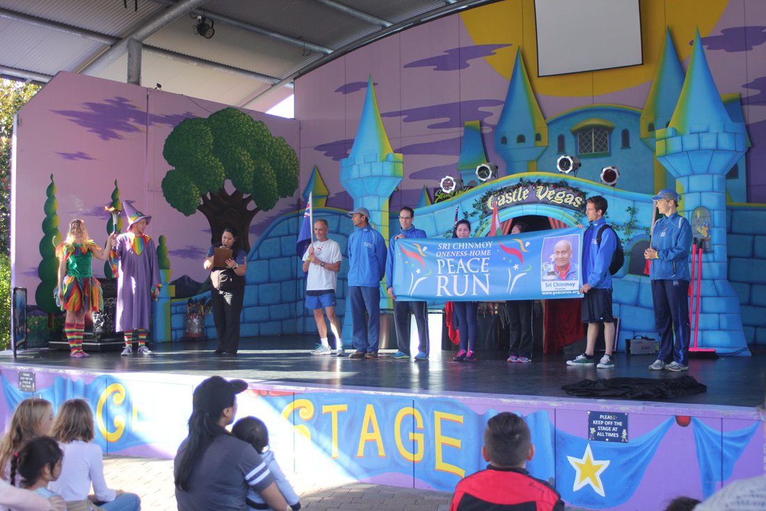 The Peace Run takes to the stage and Aroha Hauraki introduces the Peace Run to the children at Rainbow's End.