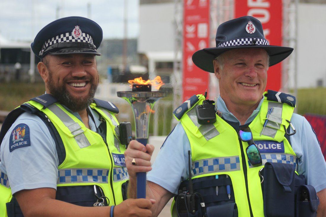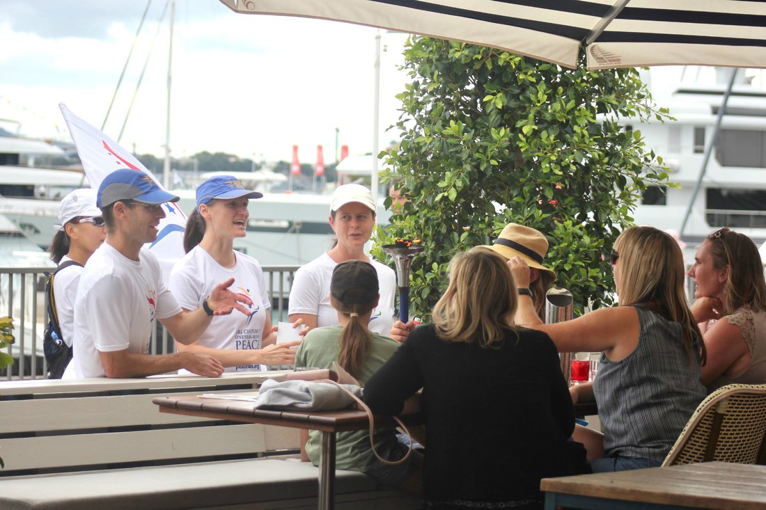 Alice, our experienced ultrarunner and new team member, shares the torch with a New Zealand supporter. In the background are the Luna Rossa sailors being interviewed on their unique talents and knowledge about the competition at hand. Of particular interest was the story of how they were the first on hand to rescue the fellow American team when it capsized under dramatic circumstances.
