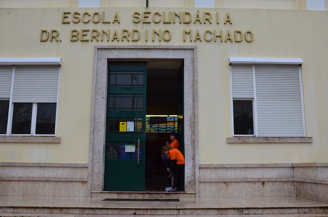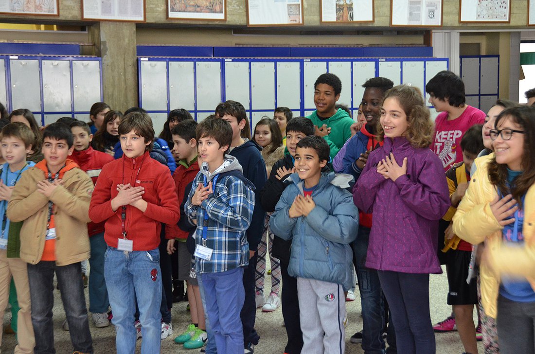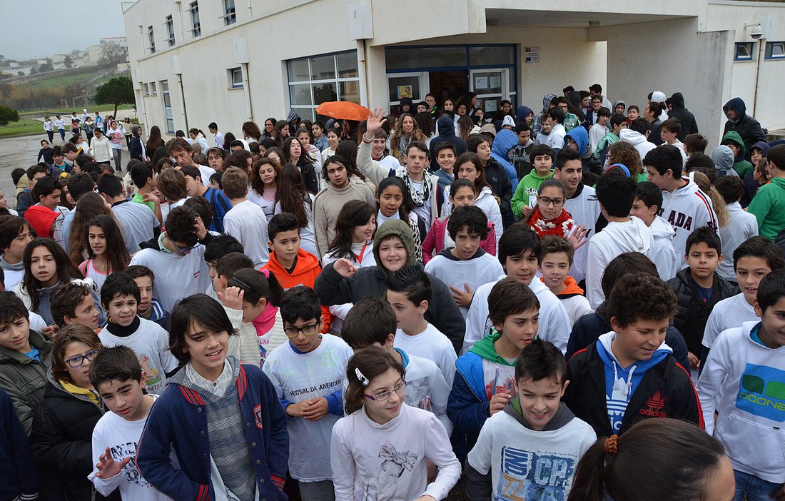 It was a rainy day, so we gathered in the sport hall of the "Escola Secundária com 3º circlo Dr. Joaquim de Carvalho".
