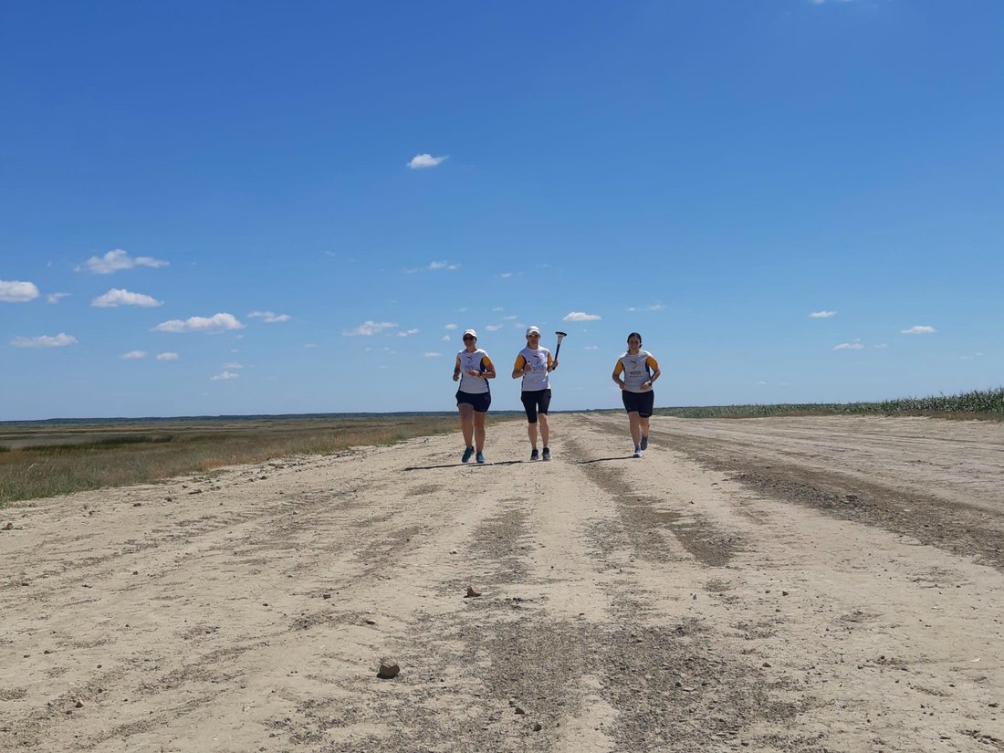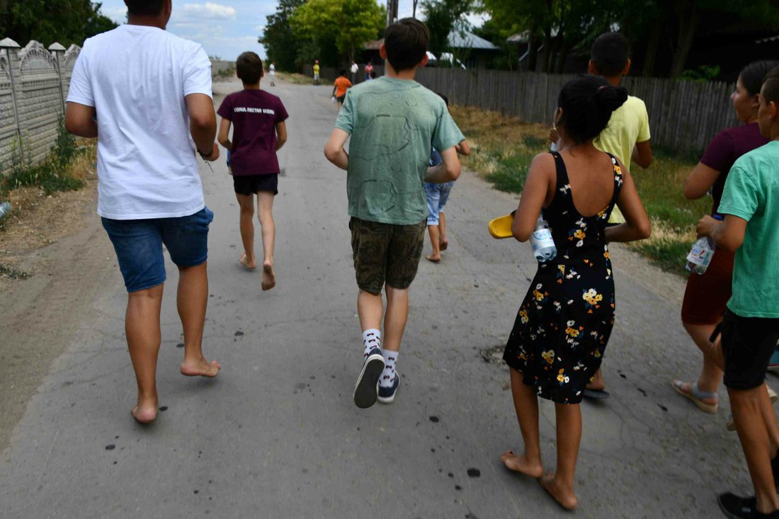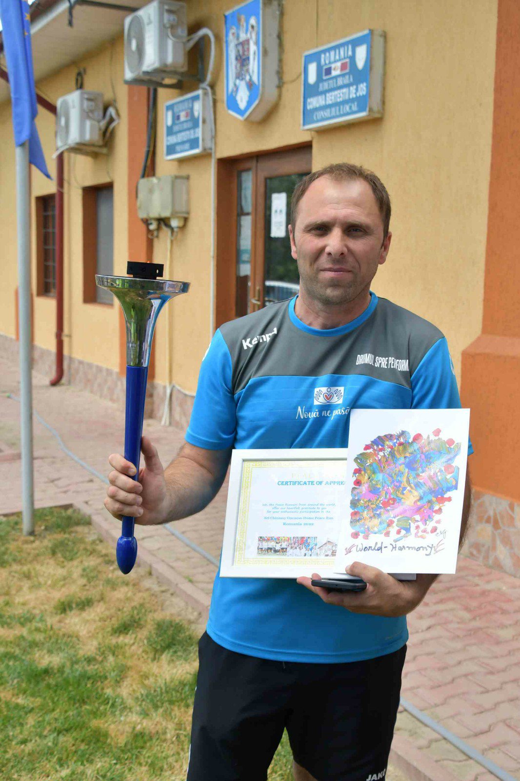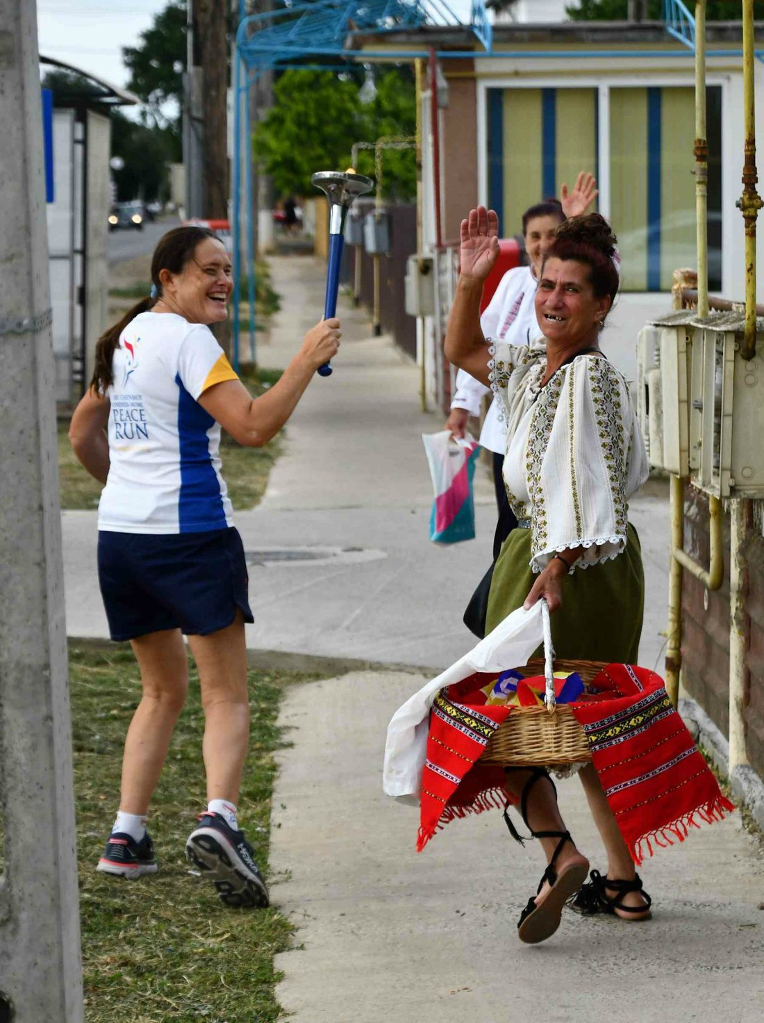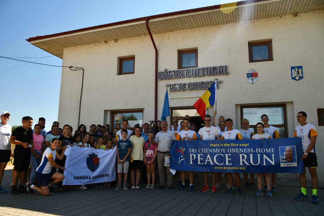 A group photo with the Peace Run banner and the Giurgeni village banner.