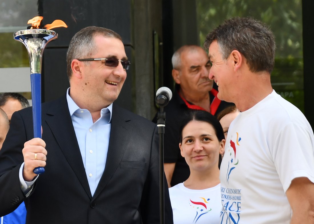 The Deputy Ambassador of Bulgaria to Serbia, holds the toch with our Bulgarian runner, Vijayanta.