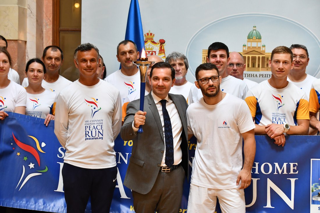The Vice President of the National Parliament, Vladimir Marinkovic, welcomes the Peace Run to the Parliament.