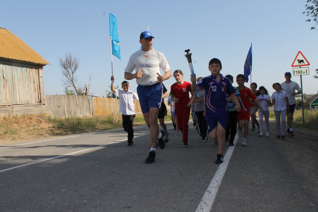 С факелом бежит председатель собрания депутатов Джалыковского СМО Сангаджиев Юрий Михайлович