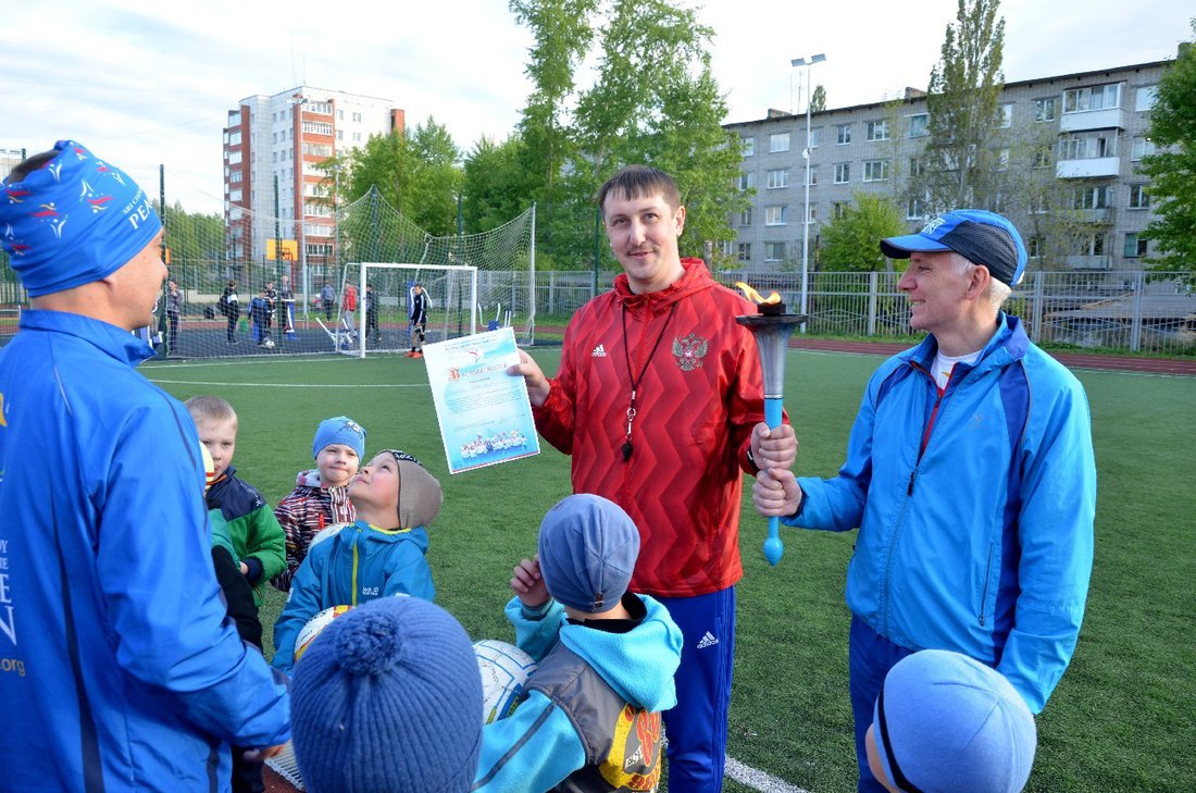 Head-trainer of the children's FC "Star" Evgeny Alexandrovich Gorelkin and his students joined the relay