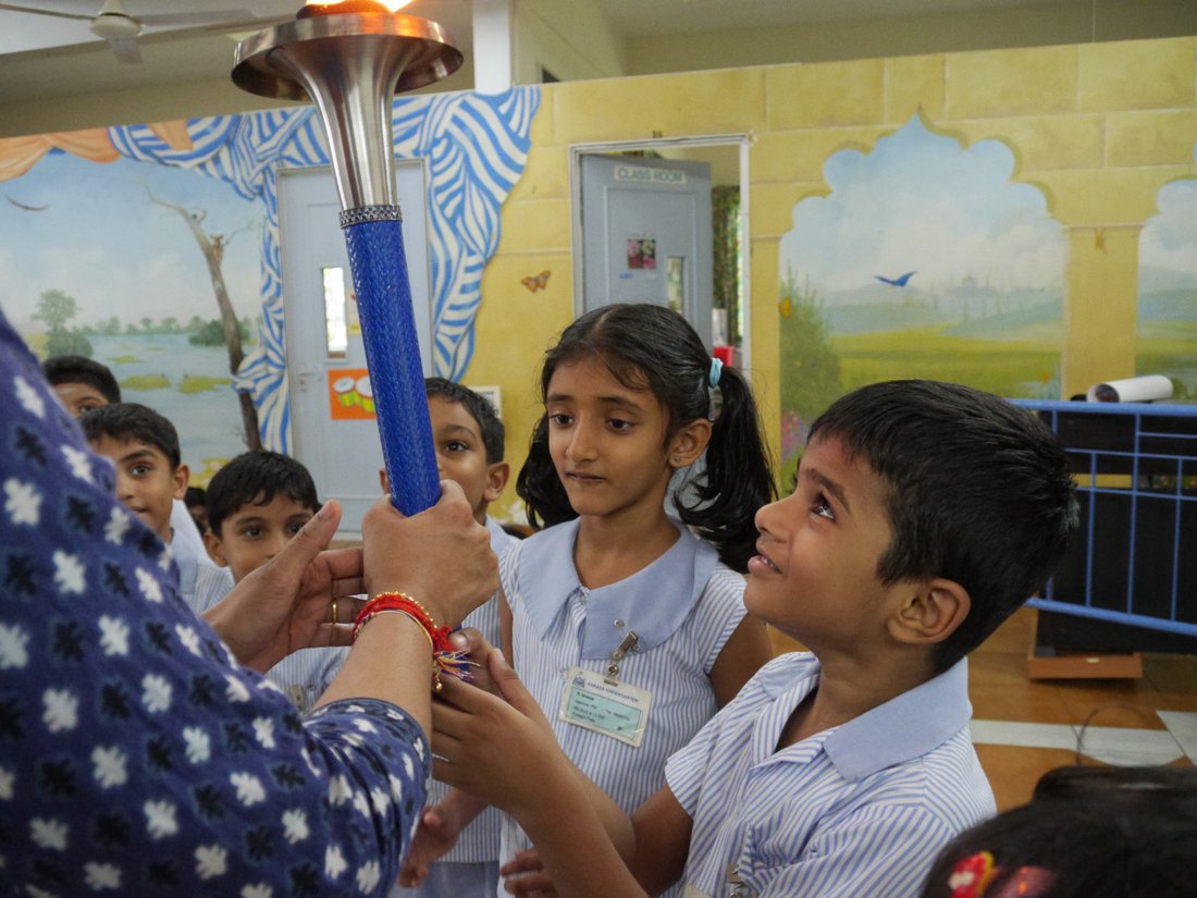 Our morning began at NPS International School with Ankith and Veera carrying the torch into the auditorium.