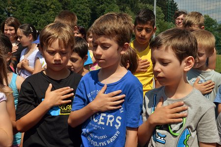 ...a group of students carried the torch to the city hall of Bohinjska Bistrica...