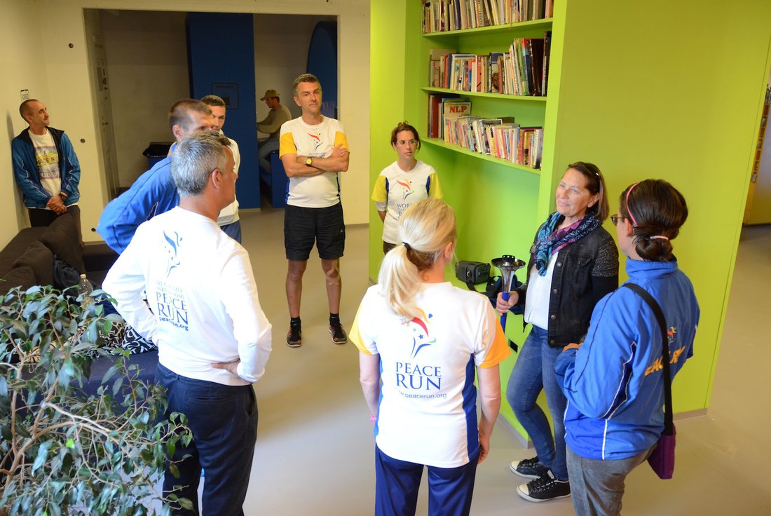 Cvetka Kernel holds the torch with two young men - Omid from Afghanistan and Ojolan from Syria. Under 18's looking for refuge are welcomed here.