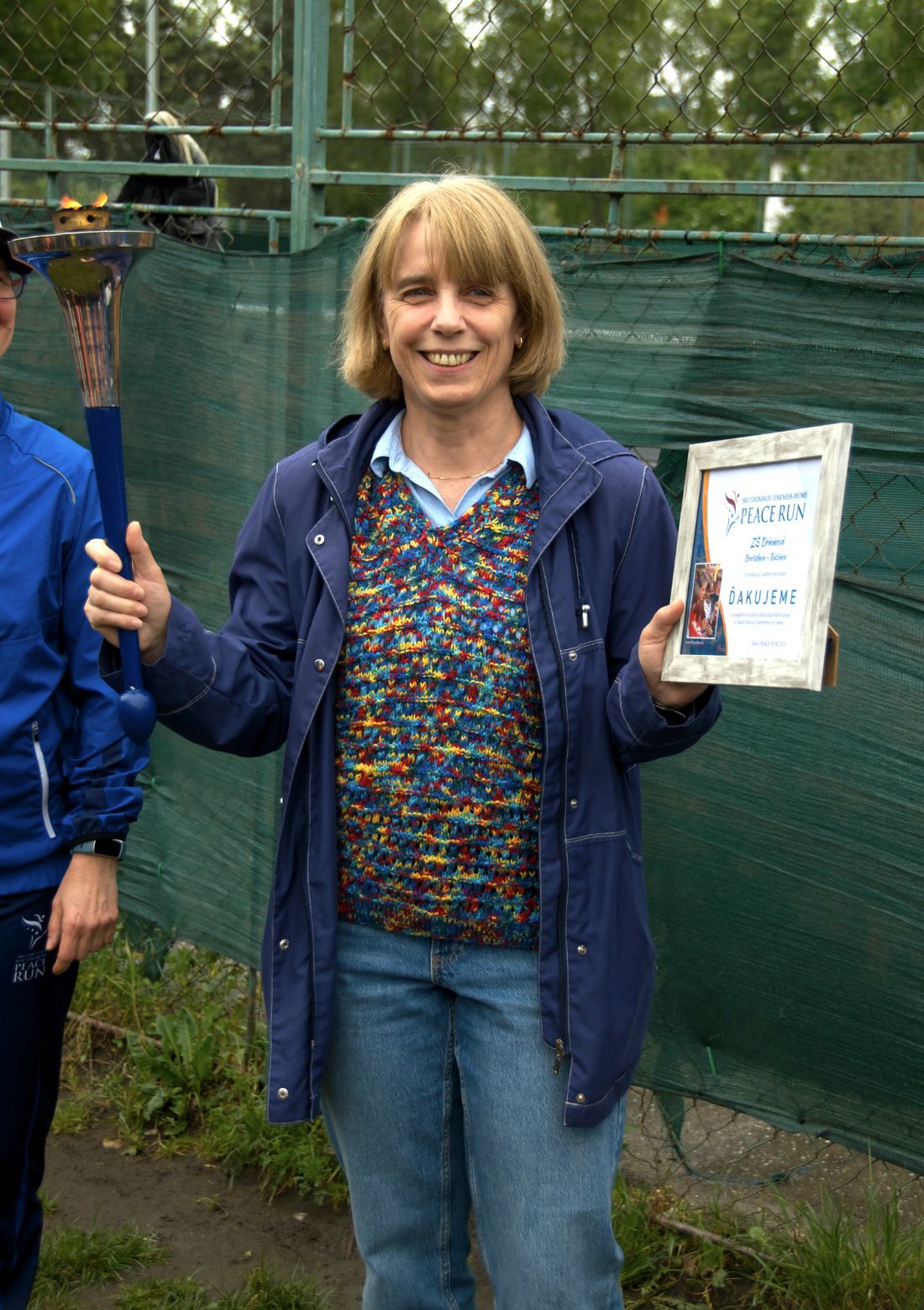 Pani zástupkyňa školy, Mgr. Dagmar Dubinová, preberá Ďakovný list v mene všetkých bežcov Mierového behu, spolu s maľbou od Sri Chinmoya, zakladateľa behu.