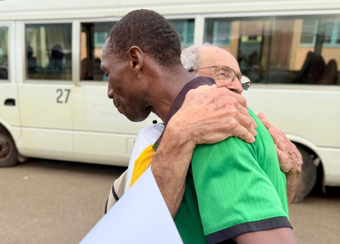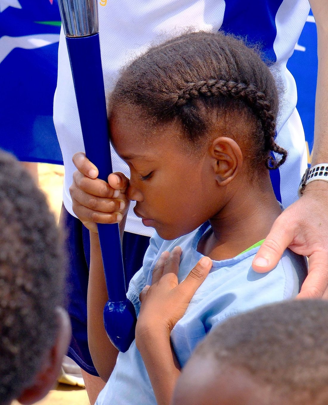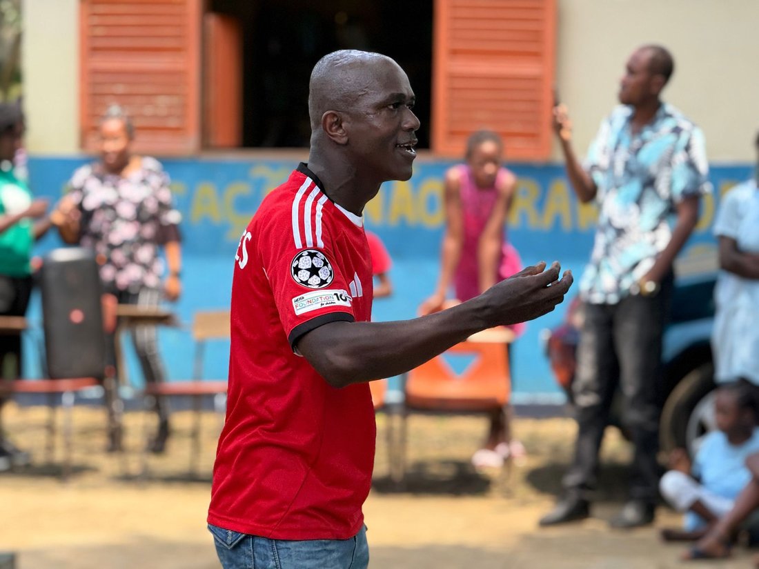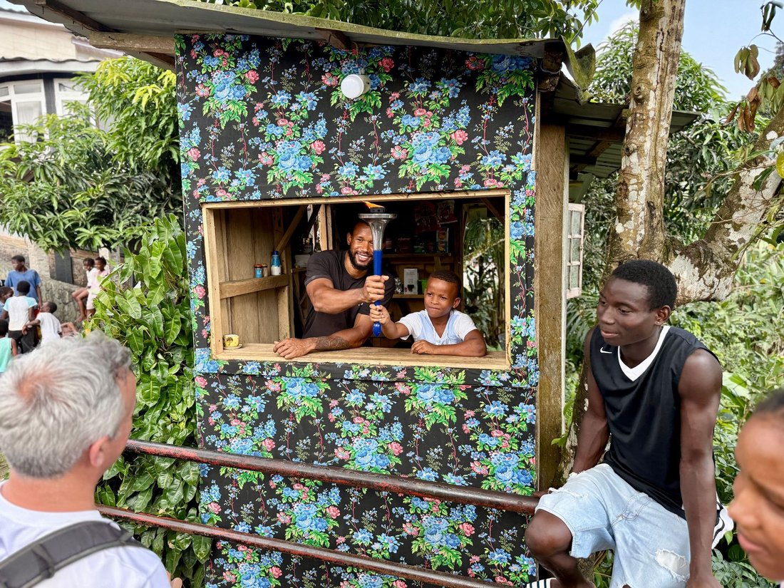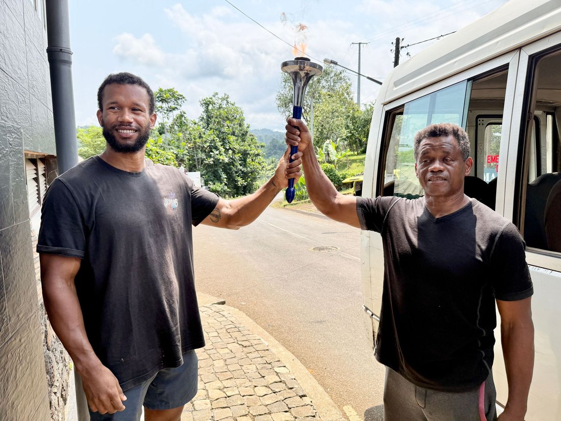 Pai (João Carlos Nezó) e Filho (Sandro Nezó) de Caué pegaram na Tocha da Paz! João Nezó, conhecido como Nezó, é um artista santomense multifacetado, pintor, escultor e músico. Ele é um dos responsáveis da oficina Zángoma, em São João dos Angolares.