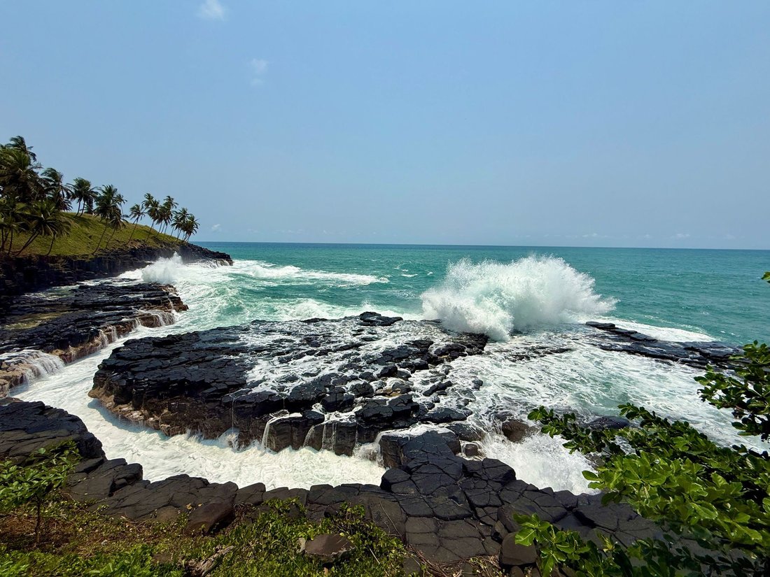 Chegámos à Boca de Inferno. Para os santomenses este local é muito mais que geologia... Reza a lenda que um cavaleiro decidiu desafiar o mar. O "sopro" de água e o barulho ensurdecedor que ouvimos não é apenas a força das ondas, mas sim a alma do cavaleiro e do seu cavalo a passar entre dois locais, São Tomé e Cascais, Portugal.